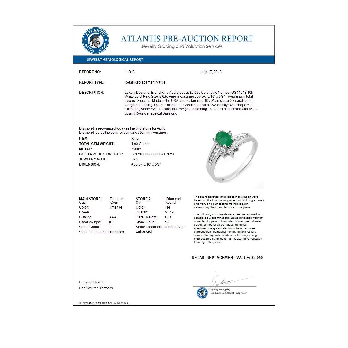REF-30A8X -11018 ---- 1.03 CTW Emerald & Diamond Ring 10K White Gold ---- Luxury Designer Brand Ring Appraised at $2,050 Certificate Number US11018 10k White gold, Ring Size is 6.5, Ring measuring approx. 5/16" x 5/8" , weighing in total approx. 3 grams. Made in the USA and is stamped 10k, Main stone 0.7 carat total weight containing 1 pieces of Intense Green color with AAA quality Oval shape cut Emerald , Stone #2 0.33 carat total weight containing 16 pieces of H-I color with VS/SI quality Round shape cut Diamond