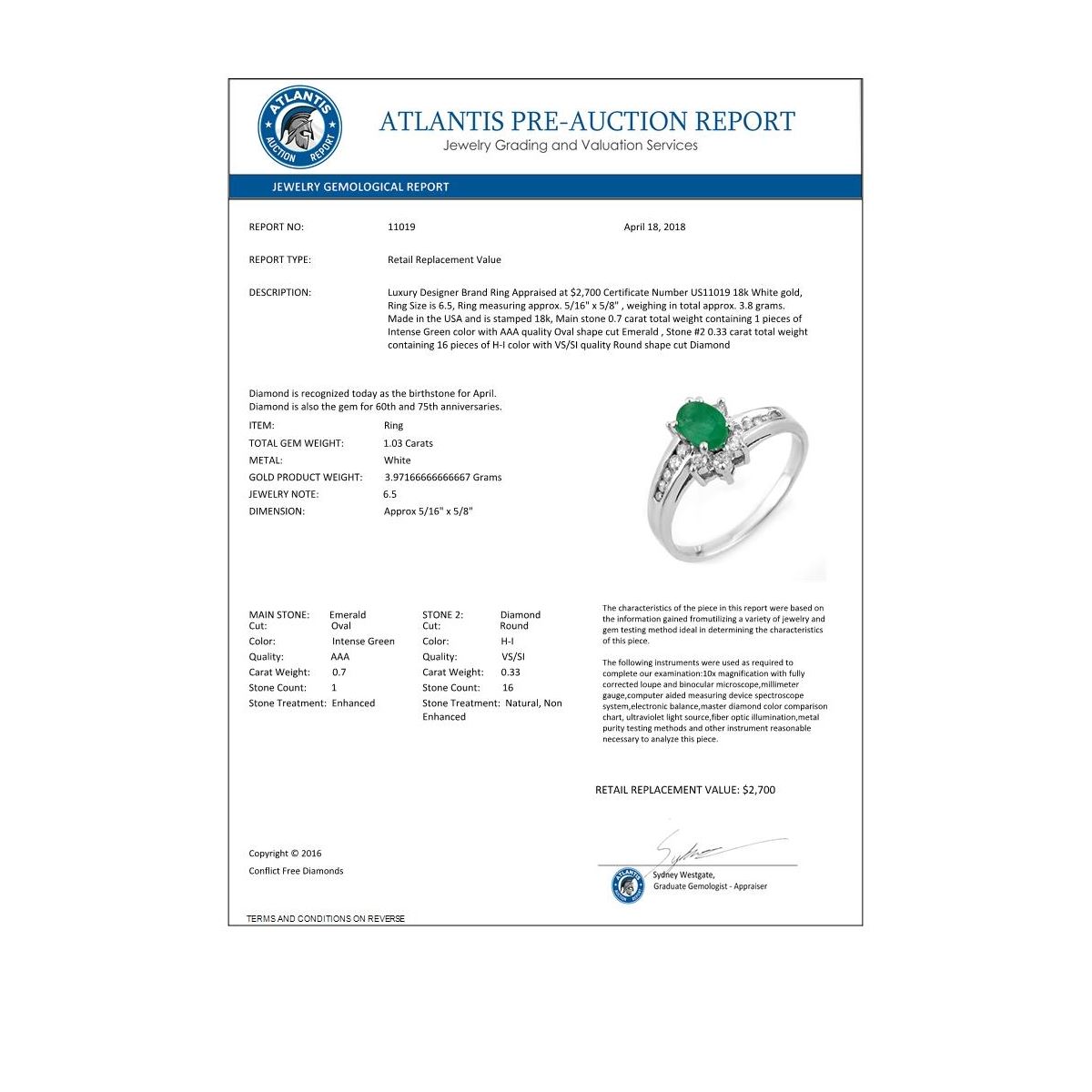 REF-41X3T -11019 ---- 1.03 CTW Emerald & Diamond Ring 18K White Gold ---- Luxury Designer Brand Ring Appraised at $2,700 Certificate Number US11019 18k White gold, Ring Size is 6.5, Ring measuring approx. 5/16" x 5/8" , weighing in total approx. 3.8 grams. Made in the USA and is stamped 18k, Main stone 0.7 carat total weight containing 1 pieces of Intense Green color with AAA quality Oval shape cut Emerald , Stone #2 0.33 carat total weight containing 16 pieces of H-I color with VS/SI quality Round shape cut Diamond