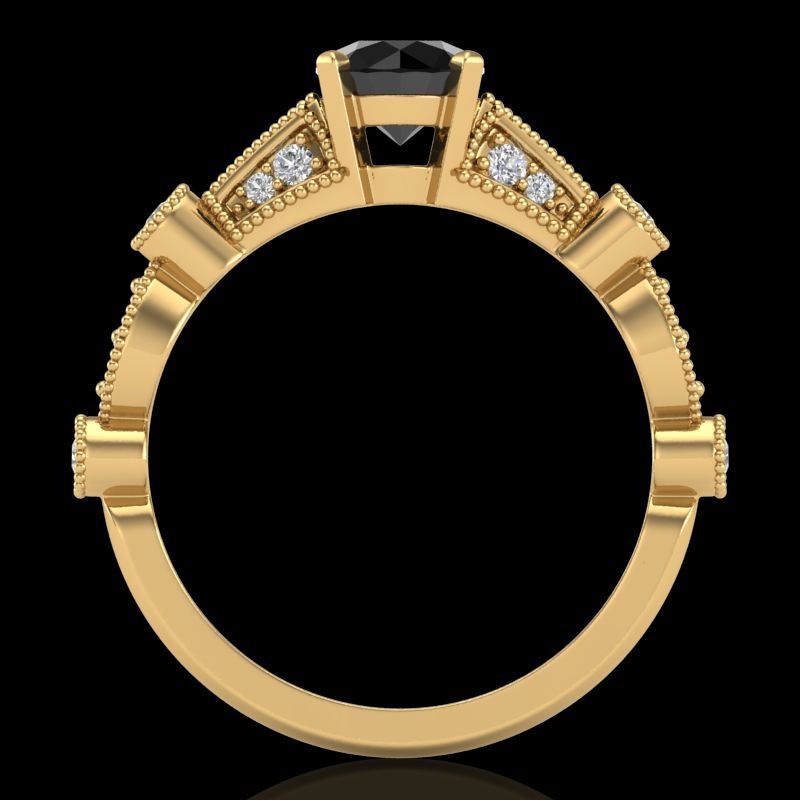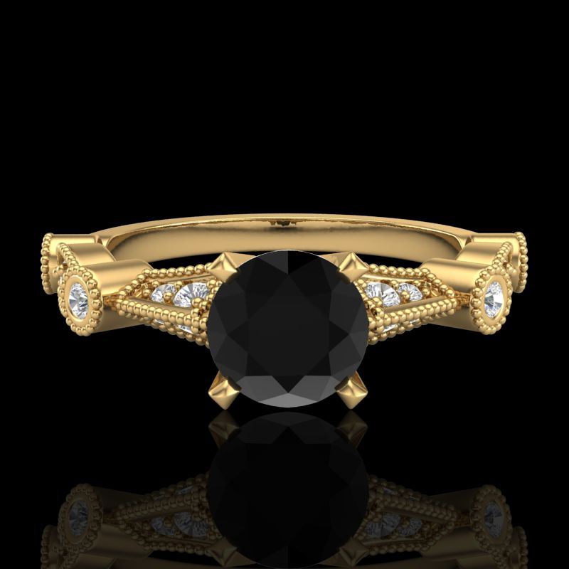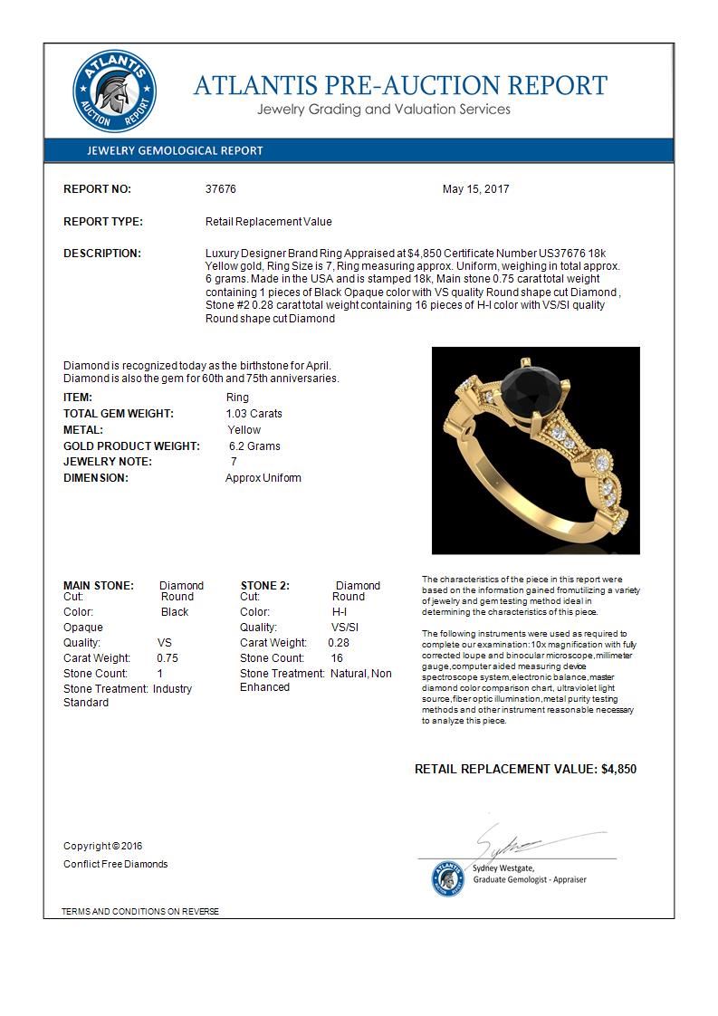 1.03 CTW Fancy Black Diamond Solitaire Engagement Art Deco Ring 18K Yellow Gold ---- Luxury Designer Brand Ring Appraised Retail Price at $4,850 ---- SKU Number US37676 18k Yellow gold Ring Size is 7, Ring measuring approx. Uniform, weighing in total approx. 6 grams. Made in the USA and is stamped 18k, Main stone 0.75 carat total weight containing 1 pieces of Black Opaque color with VS quality Round shape cut Diamond , Stone #2 0.28 carat total weight containing 16 pieces of H-I color with VS/SI quality Round shape cut