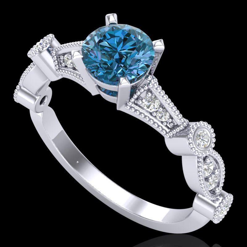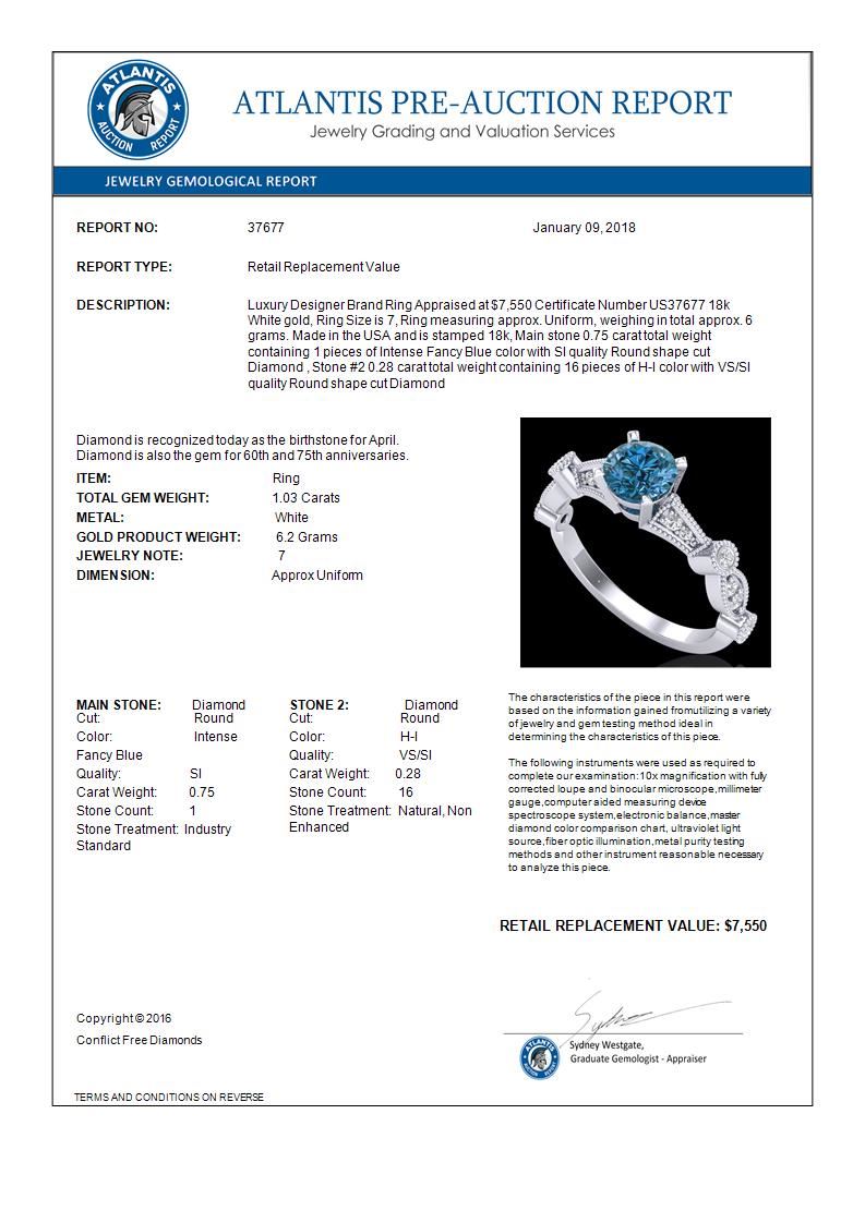 REF-114N5Y -37677 ---- 1.03 CTW Fancy Intense Blue Diamond Solitaire Art Deco Ring 18K White Gold ---- Luxury Designer Brand Ring Appraised at $7,550 Certificate Number US37677 18k White gold, Ring Size is 7, Ring measuring approx. Uniform, weighing in total approx. 6 grams. Made in the USA and is stamped 18k, Main stone 0.75 carat total weight containing 1 pieces of Intense Fancy Blue color with SI quality Round shape cut Diamond , Stone #2 0.28 carat total weight containing 16 pieces of H-I color with VS/SI quality Round shape cut Diamond