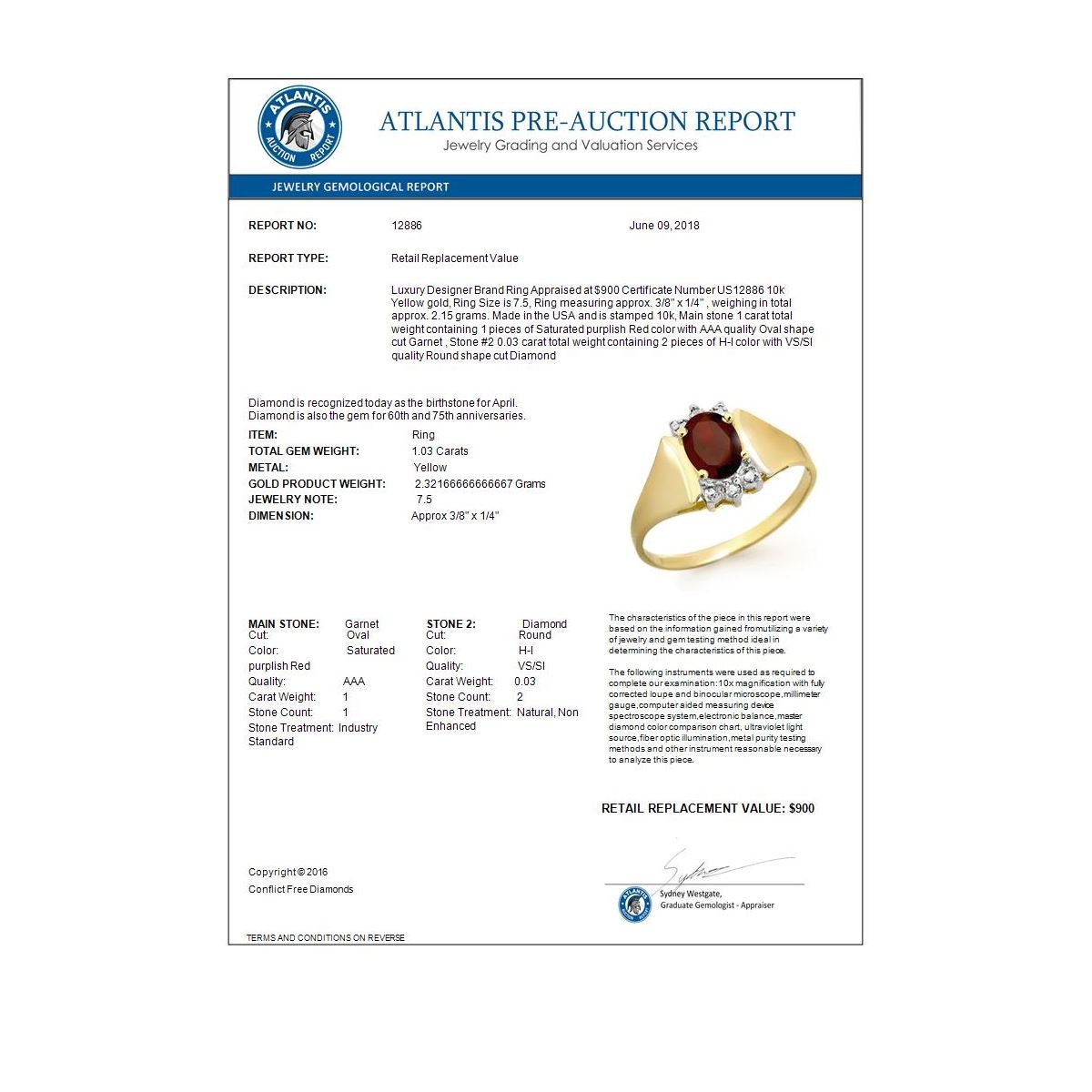 REF-15W3F -12886 ---- 1.03 CTW Garnet & Diamond Ring 10K Yellow Gold ---- Luxury Designer Brand Ring Appraised at $900 Certificate Number US12886 10k Yellow gold, Ring Size is 7.5, Ring measuring approx. 3/8" x 1/4" , weighing in total approx. 2.15 grams. Made in the USA and is stamped 10k, Main stone 1 carat total weight containing 1 pieces of Saturated purplish Red color with AAA quality Oval shape cut Garnet , Stone #2 0.03 carat total weight containing 2 pieces of H-I color with VS/SI quality Round shape cut Diamond