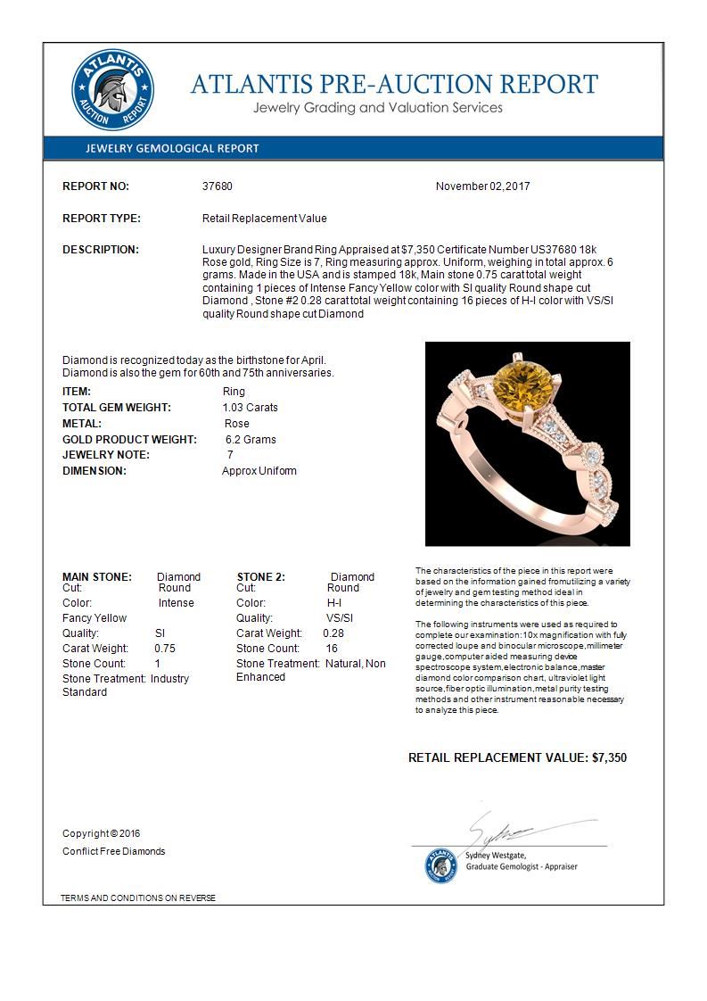 REF-121H8A -37680 ---- 1.03 CTW Intense Fancy Yellow Diamond Engagement Art Deco Ring 18K Rose Gold ---- Luxury Designer Brand Ring Appraised at $7,350 Certificate Number US37680 18k Rose gold, Ring Size is 7, Ring measuring approx. Uniform, weighing in total approx. 6 grams. Made in the USA and is stamped 18k, Main stone 0.75 carat total weight containing 1 pieces of Intense Fancy Yellow color with SI quality Round shape cut Diamond , Stone #2 0.28 carat total weight containing 16 pieces of H-I color with VS/SI quality Round shape cut Diamond