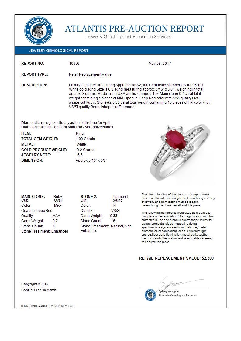 1.03 CTW Ruby & Diamond Ring 10K White Gold ---- Luxury Designer Brand Ring Appraised Retail Price at $2,300 ---- SKU Number US10906 10k White gold Ring Size is 6.5, Ring measuring approx. 5/16" x 5/8" , weighing in total approx. 3 grams. Made in the USA and is stamped 10k, Main stone 0.7 carat total weight containing 1 pieces of Mid-Opaque-Deep Red color with AAA quality Oval shape cut Ruby , Stone #2 0.33 carat total weight containing 16 pieces of H-I color with VS/SI quality Round shape cut