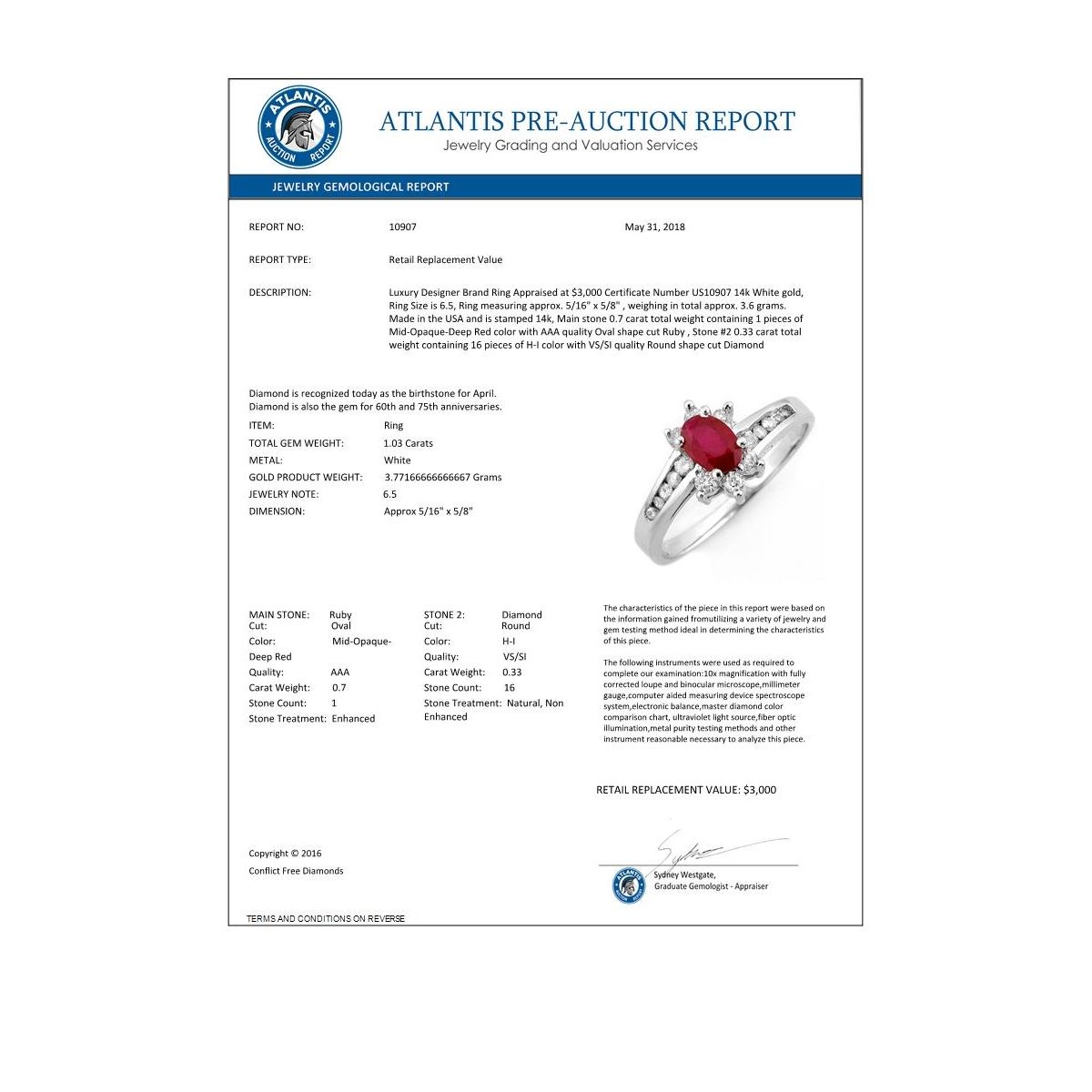 REF-45T5M -10907 ---- 1.03 CTW Ruby & Diamond Ring 14K White Gold ---- Luxury Designer Brand Ring Appraised at $3,000 Certificate Number US10907 14k White gold, Ring Size is 6.5, Ring measuring approx. 5/16" x 5/8" , weighing in total approx. 3.6 grams. Made in the USA and is stamped 14k, Main stone 0.7 carat total weight containing 1 pieces of Mid-Opaque-Deep Red color with AAA quality Oval shape cut Ruby , Stone #2 0.33 carat total weight containing 16 pieces of H-I color with VS/SI quality Round shape cut Diamond