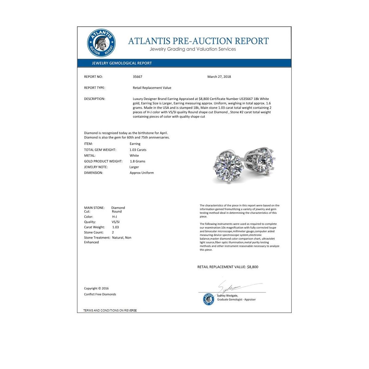 REF-178A2X -35667 ---- 1.03 CTW VS/SI Diamond Stud Solitaire Earrings 18K White Gold ---- Luxury Designer Brand Earring Appraised at $8,800 Certificate Number US35667 18k White gold, Earring Size is Larger, Earring measuring approx. Uniform, weighing in total approx. 1.6 grams. Made in the USA and is stamped 18k, Main stone 1.03 carat total weight containing 2 pieces of H-J color with VS/SI quality Round shape cut Diamond , Stone #2 carat total weight containing pieces of color with quality shape cut