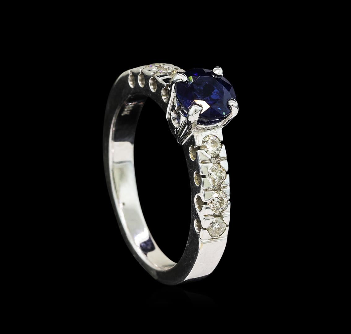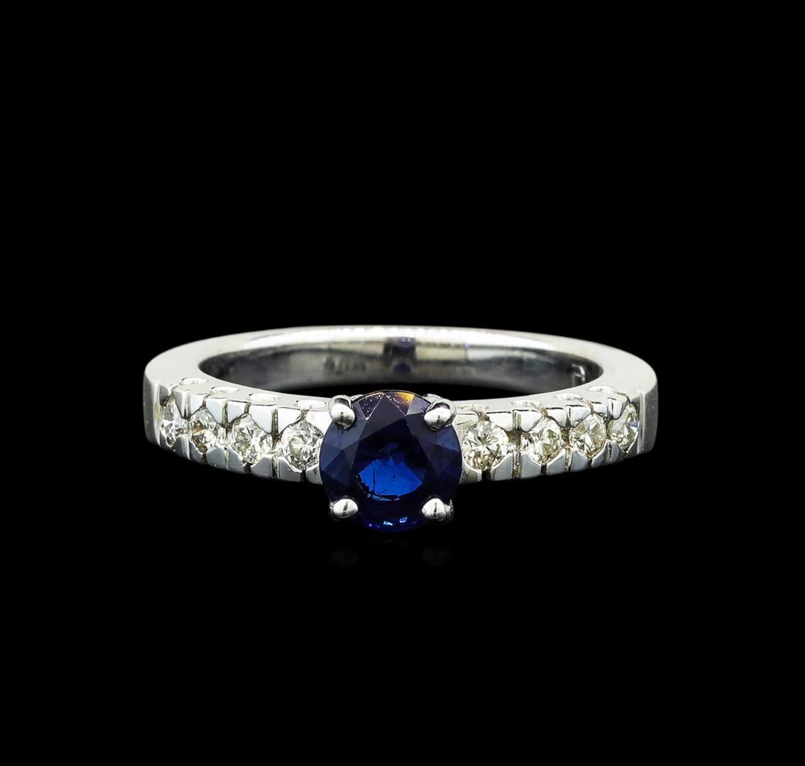 One electronically tested 18KT white gold lady's cast fashion ring with a bright polish finish. The featured lady's ring has a shank measuring 2.50 millimeters wide. Identified with markings of '18K'. Condition is new, good workmanship. Containing: One prong set round modified mixed cut natural blue sapphire, measuring 5.89 - 5.81 x 3.47 mm, (depth est.) 8%. bulge factor, approximate weight of 1.03ct., clarity is slightly included, medium dark, moderately strong, blue color, (GIA B 6/4), cut is very good. Transmitting light with a minimum of distortion, transparent. Colored gemstones are presumed to have been subjected to commonly used enhancement processes. Graded in the setting. Eight prong set round brilliant cut diamonds, measuring 2.20 - 2.10 x 1.33mm (depth est.) approximate total weight of 8 Stones = 0.30ct. Graded in the setting. Clarity SI-1 to SI-2. Color: H - I Cut Good. Total Weight of Colored Stones 1.03ct.. Total Weight of Diamonds 0.30ct.. Total Weight of Ring 4.90gm GAS Appraised at $3,825.00.