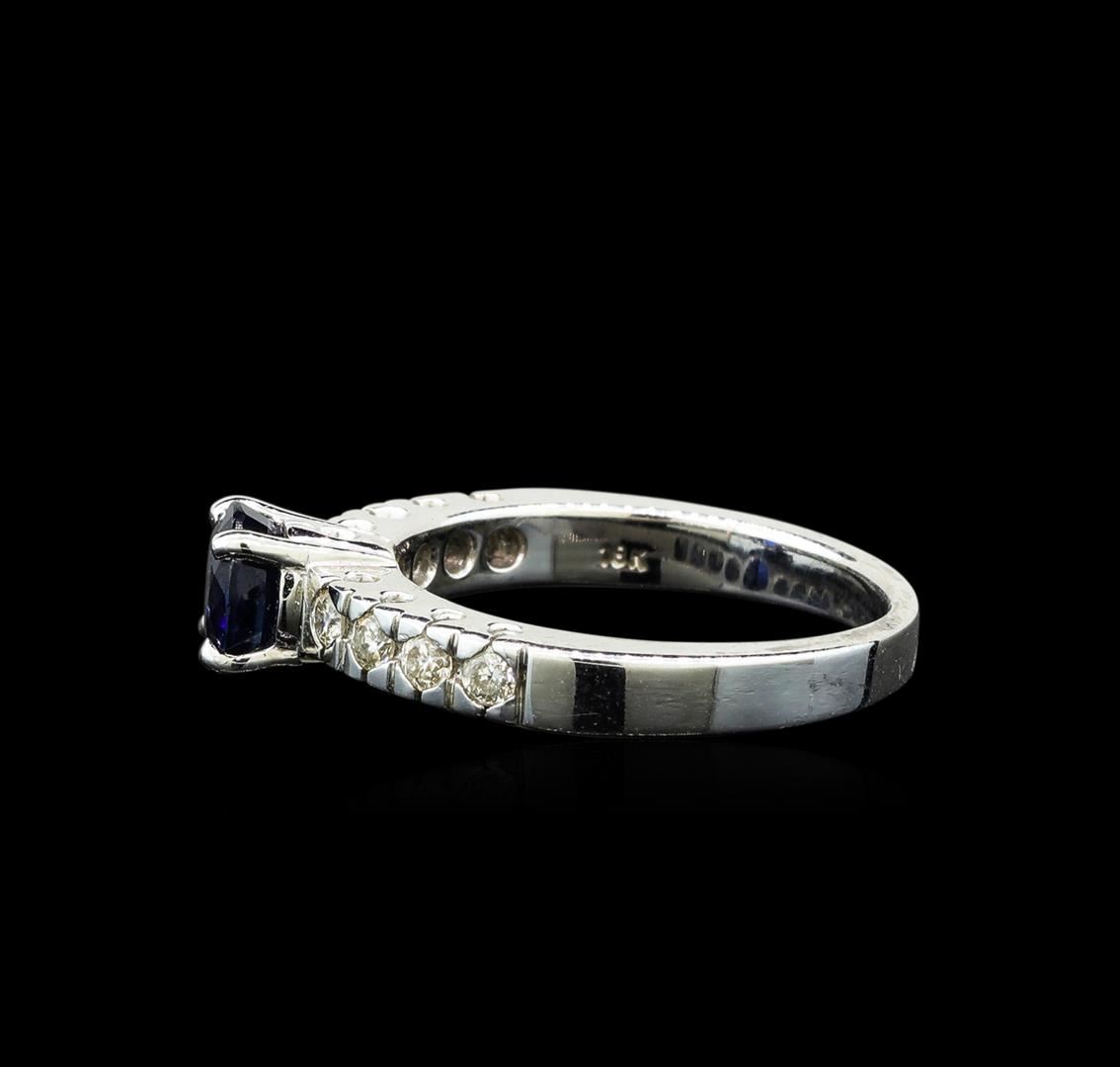 One electronically tested 18KT white gold lady's cast fashion ring with a bright polish finish. The featured lady's ring has a shank measuring 2.50 millimeters wide. Identified with markings of '18K'. Condition is new, good workmanship. Containing: One prong set round modified mixed cut natural blue sapphire, measuring 5.89 - 5.81 x 3.47 mm, (depth est.) 8%. bulge factor, approximate weight of 1.03ct., clarity is slightly included, medium dark, moderately strong, blue color, (GIA B 6/4), cut is very good. Transmitting light with a minimum of distortion, transparent. Colored gemstones are presumed to have been subjected to commonly used enhancement processes. Graded in the setting. Eight prong set round brilliant cut diamonds, measuring 2.20 - 2.10 x 1.33mm (depth est.) approximate total weight of 8 Stones = 0.30ct. Graded in the setting. Clarity SI-1 to SI-2. Color: H - I Cut Good. Total Weight of Colored Stones 1.03ct.. Total Weight of Diamonds 0.30ct.. Total Weight of Ring 4.90gm GAS Appraised at $3,825.00.
