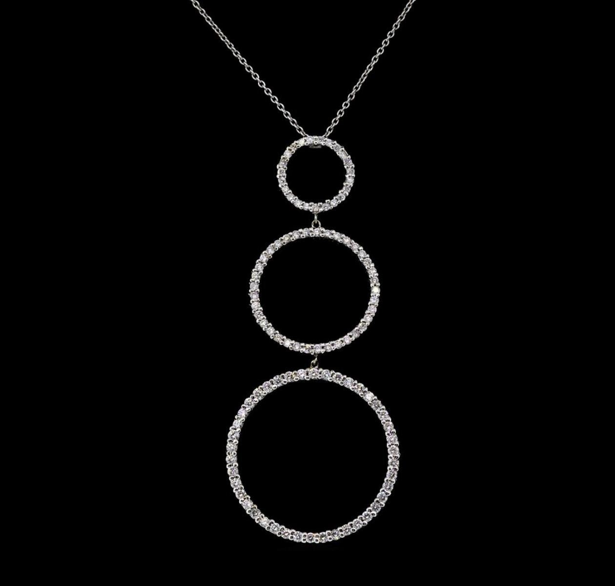 One lady's graduated three circle motif pendant with chain featuring: 18KT white gold weighing 6.8 grams containing diamonds weighing 1.03ctw. The pendant has a sixteen inch 1mm thick oval cable link chain.