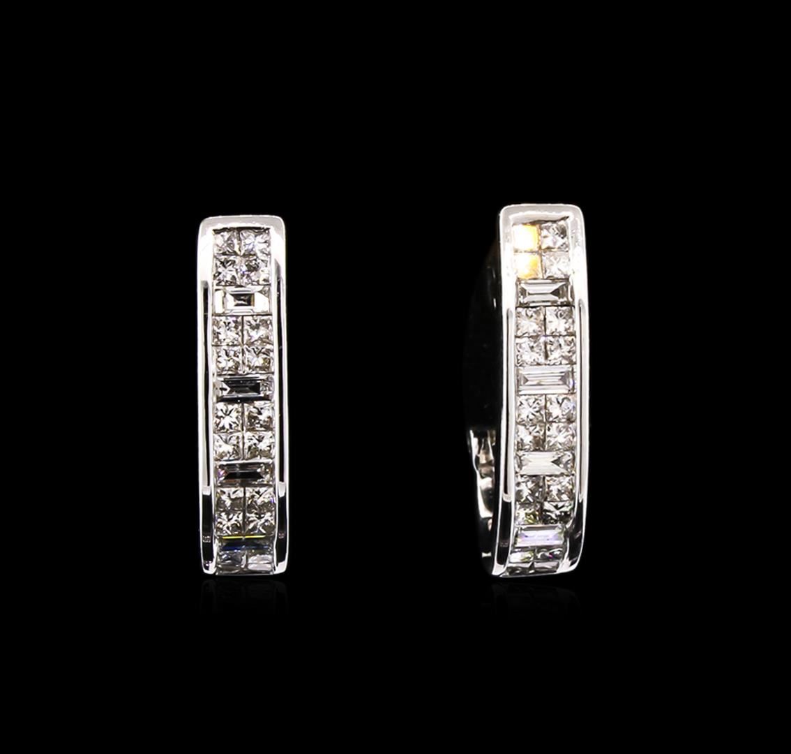 One pair electronically tested 14KT white gold lady's combination cast & assembled hoop style earrings with Omega clip backs with posts with a bright polish finish. Identified with markings of "14K". Condition is new, good workmanship. Containing: Eight channel set baguette cut diamonds, measuring 3.00 x 1.30 x 1.11mm (depth est.) approximate total weight of 8 Stones = 0.30ct. Graded in the setting. Clarity: VS-2 to SI-1. Color: G - H. Cut Good Forty invisible set princess cut diamonds, measuring 1.45 x 1.45 x 1.09mm (depth est.) approximate total weight of 40 Stones = 0.73ct. Graded in the setting. Clarity: SI-1 to SI-2. Color: H - I. Cut Good. Total Weight of Diamonds 1.03ct. Total Weight of Earrings 5.50gm. GAS Appraised at $3,895.00.