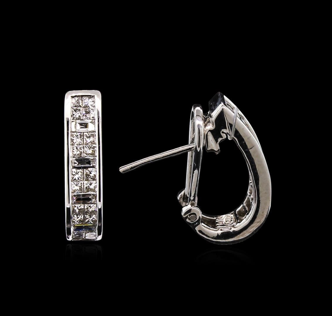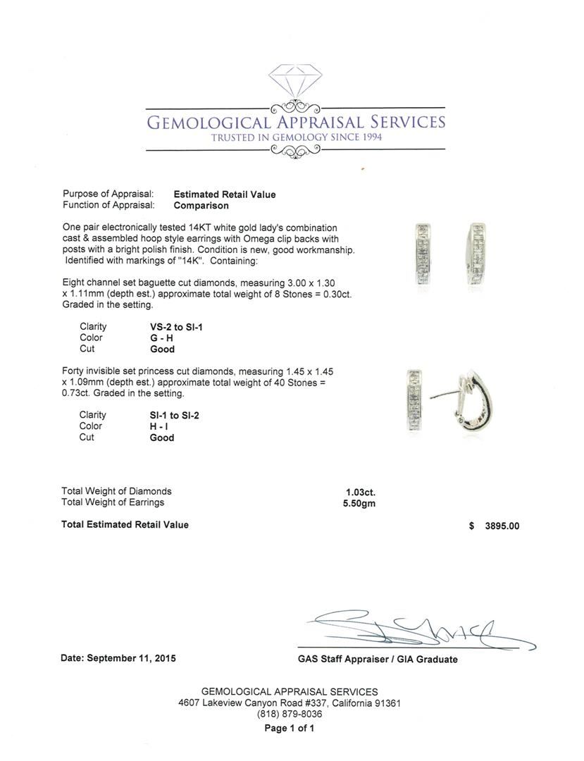 One pair electronically tested 14KT white gold lady's combination cast & assembled hoop style earrings with Omega clip backs with posts with a bright polish finish. Identified with markings of "14K". Condition is new, good workmanship. Containing: Eight channel set baguette cut diamonds, measuring 3.00 x 1.30 x 1.11mm (depth est.) approximate total weight of 8 Stones = 0.30ct. Graded in the setting. Clarity: VS-2 to SI-1. Color: G - H. Cut Good Forty invisible set princess cut diamonds, measuring 1.45 x 1.45 x 1.09mm (depth est.) approximate total weight of 40 Stones = 0.73ct. Graded in the setting. Clarity: SI-1 to SI-2. Color: H - I. Cut Good. Total Weight of Diamonds 1.03ct. Total Weight of Earrings 5.50gm. GAS Appraised at $3,895.00.