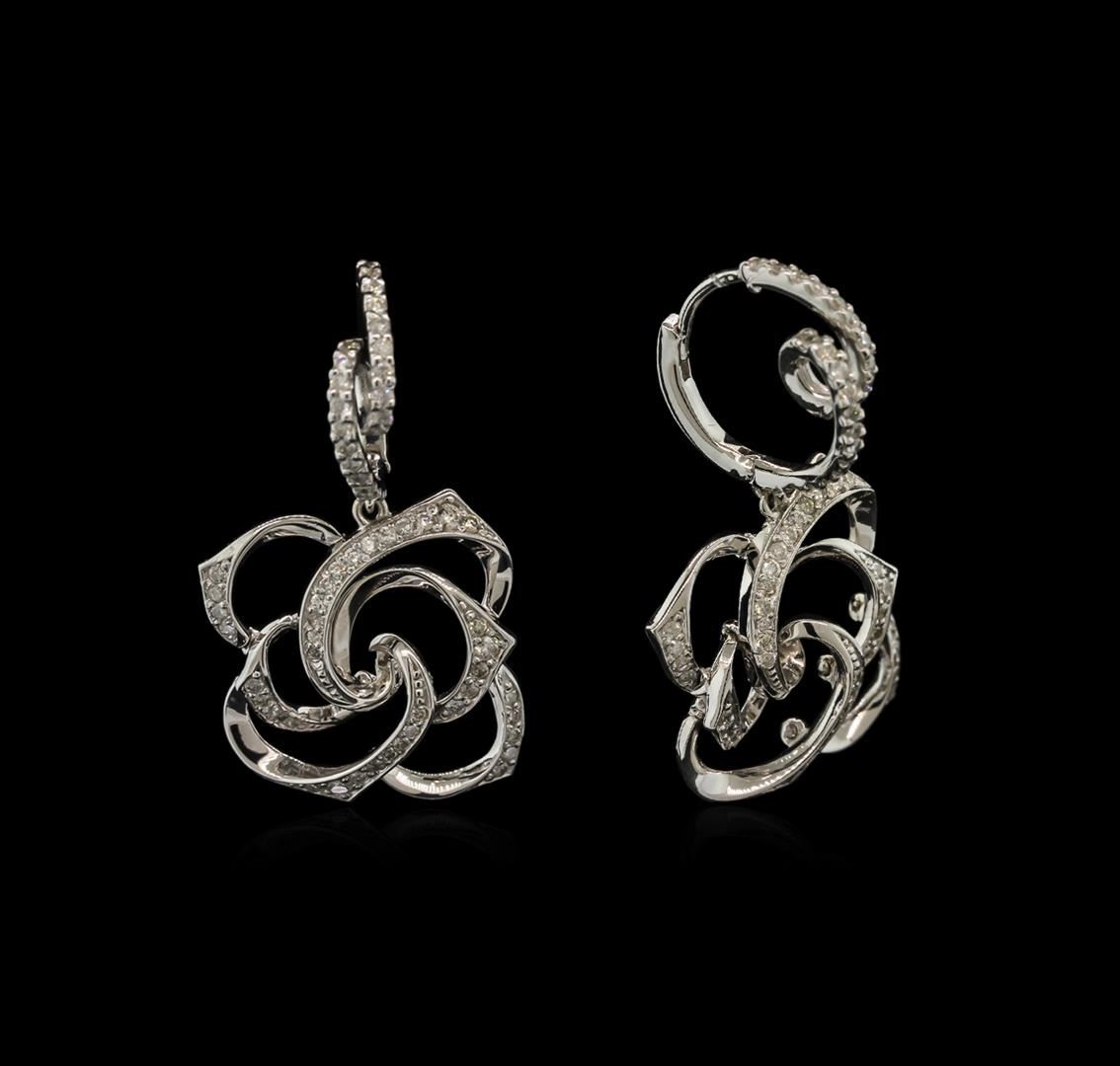 One pair electronically tested 14KT white gold lady's combination cast & assembled flower design earrings with hinged clip backs with a bright polish finish. Identified with markings of "585". Condition is new, good workmanship. Containing: One Hundred Twenty-Eight prong set round brilliant cut diamonds, measuring 1.30 - 1.25 x 0.81mm (depth est.) approximate total weight of 128 Stones = 1.03ct. Graded in the setting. Clarity: SI-2 to I-1. Color: H - I. Cut Good. Total Weight of Diamonds 1.03ct. Total Weight of Earrings 8.10gm. GAS Appraised at $3,970.00.