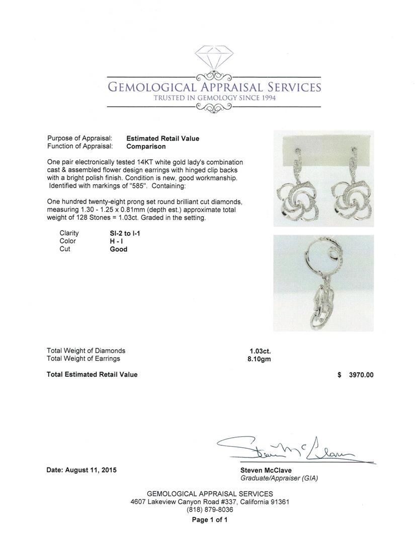 One pair electronically tested 14KT white gold lady's combination cast & assembled flower design earrings with hinged clip backs with a bright polish finish. Identified with markings of "585". Condition is new, good workmanship. Containing: One Hundred Twenty-Eight prong set round brilliant cut diamonds, measuring 1.30 - 1.25 x 0.81mm (depth est.) approximate total weight of 128 Stones = 1.03ct. Graded in the setting. Clarity: SI-2 to I-1. Color: H - I. Cut Good. Total Weight of Diamonds 1.03ct. Total Weight of Earrings 8.10gm. GAS Appraised at $3,970.00.