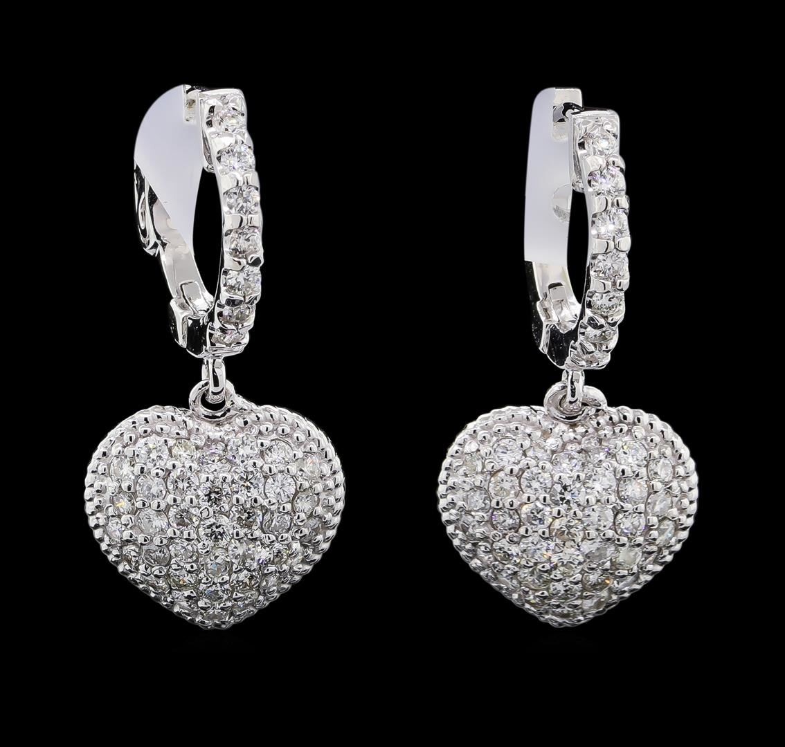 One pair electronically tested 14KT white gold lady's combination cast & assembled heart shape dangle earrings with hinged, snap locking posts with a bright polish finish. The featured lady's earrings have a drop of 25 millimeters. Identified with markings of 'K14'. Condition is new, good workmanship. Containing: Thirty-Six prong set round brilliant cut diamonds, measuring 1.60 - 1.50 x 0.96mm (depth est.) approximate total weight of 36 Stones = 0.51ct. Graded in the setting. Clarity SI-1 to SI-3. Color: G - H Cut Good Fifty prong set round brilliant cut diamonds, measuring 1.40 - 1.35 x 0.86mm (depth est.) approximate total weight of 50 Stones = 0.52ct. Graded in the setting. Clarity SI-1 to SI-2. Color: G - H Cut Good. Total Weight of Diamonds 1.03ct.. Total Weight of Earrings 5.20gm. GAS Appraised at $3,895.00.