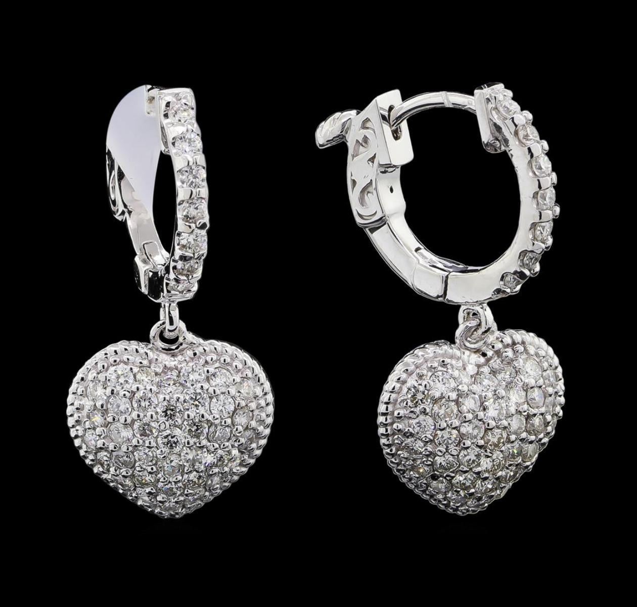 One pair electronically tested 14KT white gold lady's combination cast & assembled heart shape dangle earrings with hinged, snap locking posts with a bright polish finish. The featured lady's earrings have a drop of 25 millimeters. Identified with markings of 'K14'. Condition is new, good workmanship. Containing: Thirty-Six prong set round brilliant cut diamonds, measuring 1.60 - 1.50 x 0.96mm (depth est.) approximate total weight of 36 Stones = 0.51ct. Graded in the setting. Clarity SI-1 to SI-3. Color: G - H Cut Good Fifty prong set round brilliant cut diamonds, measuring 1.40 - 1.35 x 0.86mm (depth est.) approximate total weight of 50 Stones = 0.52ct. Graded in the setting. Clarity SI-1 to SI-2. Color: G - H Cut Good. Total Weight of Diamonds 1.03ct.. Total Weight of Earrings 5.20gm. GAS Appraised.