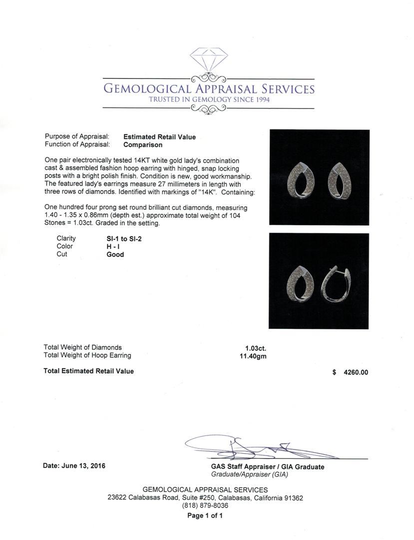One pair electronically tested 14KT white gold lady's combination cast & assembled fashion hoop earring with hinged, snap locking posts with a bright polish finish. The featured lady's earrings measure 27 millimeters in length with three rows of diamonds. Identified with markings of "14K". Condition is new, good workmanship. Containing: One Hundred Four prong set round brilliant cut diamonds, measuring 1.40 - 1.35 x 0.86mm (depth est.) approximate total weight of 104 Stones = 1.03ct. Graded in the setting. Clarity: SI-1 to SI-2. Color: H - I. Cut Good. Total Weight of Diamonds 1.03ct. Total Weight of Hoop Earring 11.40gm. GAS Appraised at $4,260.00.