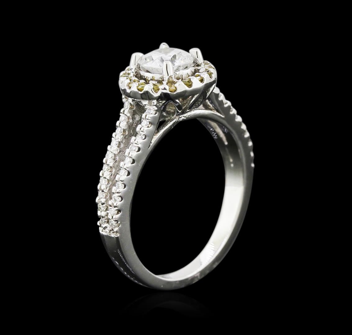 One stamped & tested 14KT white gold lady's cast wedding ring with a split shank with a bright polish finish. Condition is new. Identified with markings of "14K". Containing: One prong set round brilliant cut diamond, measuring 5.50 - 5.30 x 3.51mm (depth est.) approximate weight of 0.65ct. Clarity: I-1. Color: F. Cut: Fair. Eighteen shared prong set round brilliant cut diamonds, measuring 1.30 - 1.25 x 0.77mm (depth est.) approximate total weight of 18 Stones = 0.18ct, clarity enhanced. Clarity: SI-1 to SI-2. Color: Fancy Yellow Green. Cut: Very Good. Forty shared prong set round brilliant cut diamonds, measuring 1.10 - 1.00 x 0.68mm (depth est.) approximate total weight of 40 Stones = 0.20ct. Clarity: VS-2 to SI-2. Color: G - H. Cut: Very Good. Total Weight of Diamonds: 1.03ct. Total Weight of Ring: 5.10 gm. GAS Appraised at $4,535.00.