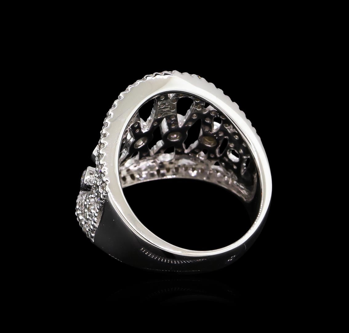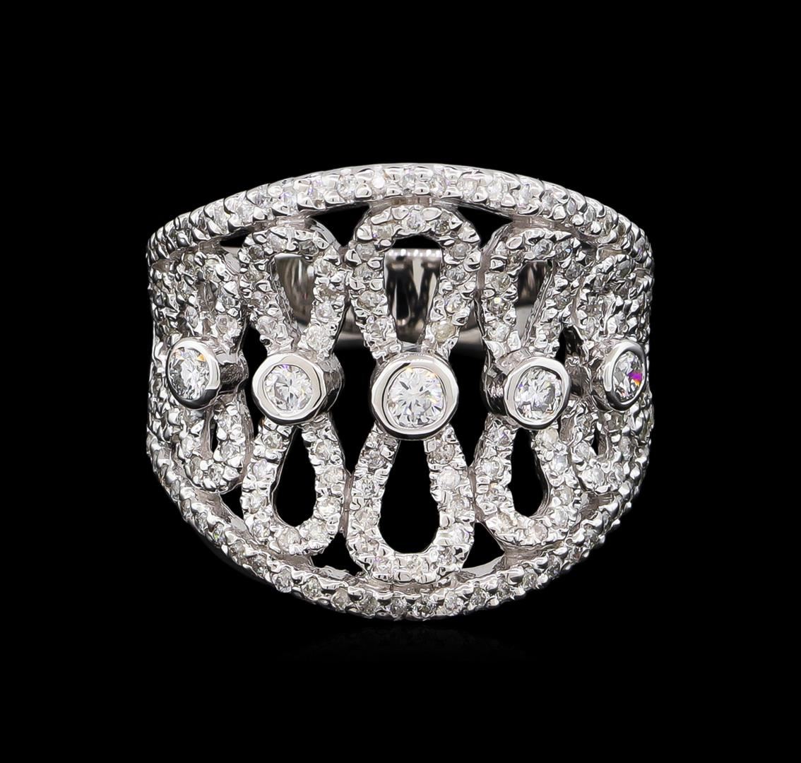 One electronically tested 14KT white gold lady's cast fashion ring with a tapered shank with a bright polish finish. The featured lady's ring has five figure 8 motifs with a wide band and a shank measuring 4.27 millimeters wide. Identified with markings of "K14". Condition is new, good workmanship. Containing: One bezel set round brilliant cut diamond, measuring 2.80 - 2.75 x 1.73mm (depth est.) approximate weight of 0.08ct. Graded in the setting. Clarity: SI-1. Color: Very Good Four bezel set round brilliant cut diamonds, measuring 2.40 - 2.30 x 1.46mm (depth est.) approximate total weight of 4 Stones = 0.20ct. Graded in the setting. Clarity: SI-1 to SI-2. Color: H - I. Cut Very Good One Hundred Fifty-Two prong set round brilliant cut diamonds, measuring 1.15 - 1.05 x 0.67mm (depth est.) approximate total weight of 152 Stones = 0.75ct. Graded in the setting. Clarity: SI-1 to I-1. Color: H - I. Cut Good. Total Weight of Diamonds 1.03ct. Total Weight of Ring 7.80gm. GAS Appraised at $5,535.00.