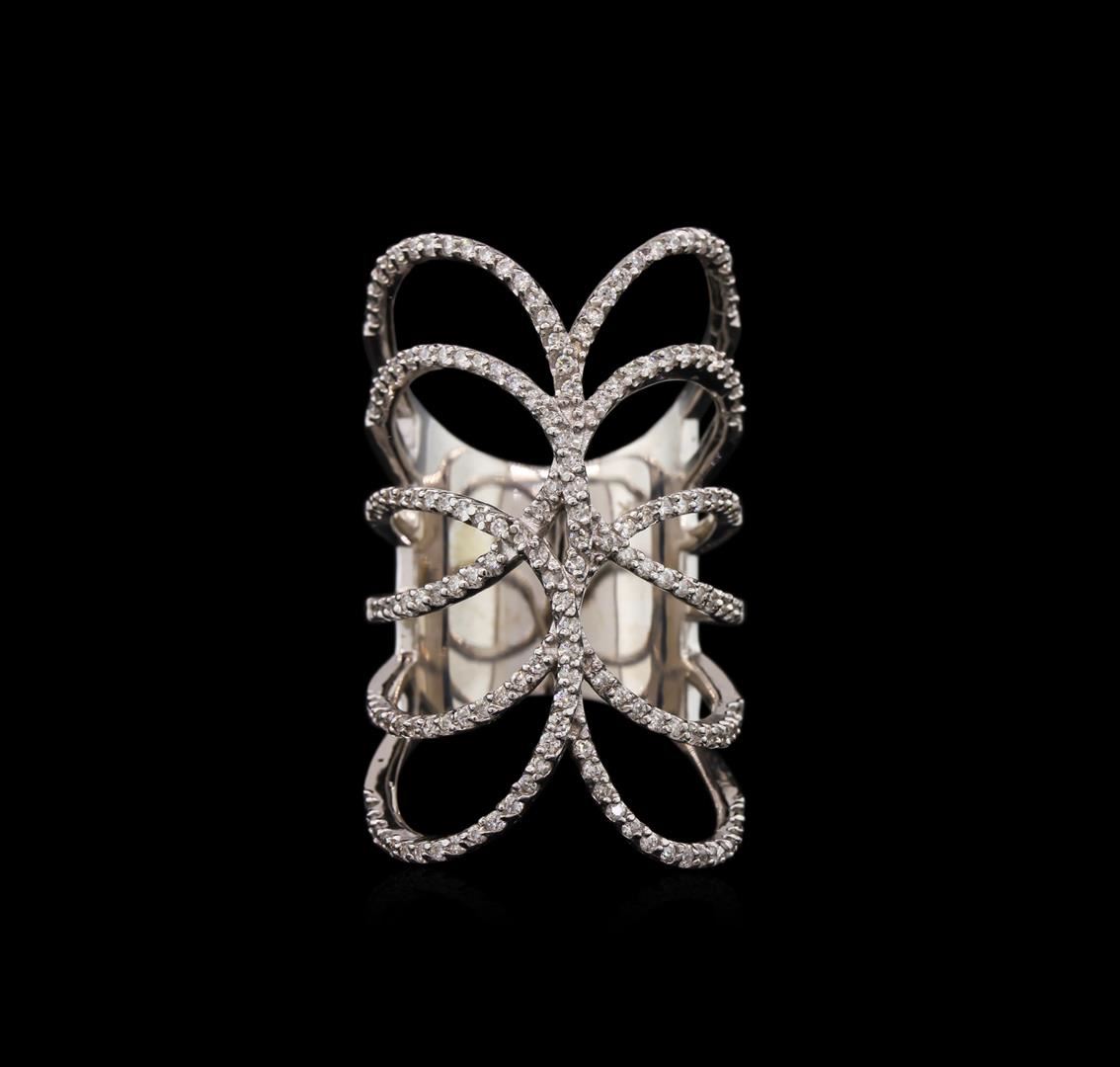 One electronically tested 14KT white gold ladies cast diamond ring with a bright polish finish. The ring features a series of intertwining diamond set ribbons, completed by a fourteen millimeter wide band. Identified with markings of "14K". Condition is new, good workmanship. Containing: One Hundred Seventy-Five prong set round brilliant cut diamonds, measuring 1.20 - 1.10 x 0.69mm exact total weight 175 Stones = 1.03ct. Graded in the setting. Clarity: SI-1 to I-1. Color: G - I. Total Weight of Diamonds 1.03ct. Total Weight of Ring 12.41gm. AIG Appraised at $5,795.00.