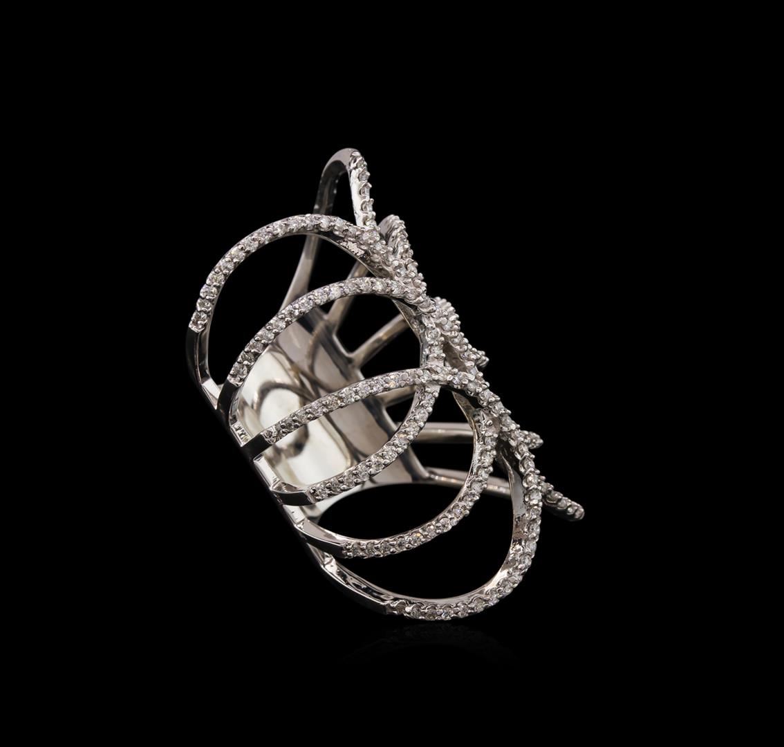 One electronically tested 14KT white gold ladies cast diamond ring with a bright polish finish. The ring features a series of intertwining diamond set ribbons, completed by a fourteen millimeter wide band. Identified with markings of "14K". Condition is new, good workmanship. Containing: One Hundred Seventy-Five prong set round brilliant cut diamonds, measuring 1.20 - 1.10 x 0.69mm exact total weight 175 Stones = 1.03ct. Graded in the setting. Clarity: SI-1 to I-1. Color: G - I. Total Weight of Diamonds 1.03ct. Total Weight of Ring 12.41gm. AIG Appraised at $5,795.00.