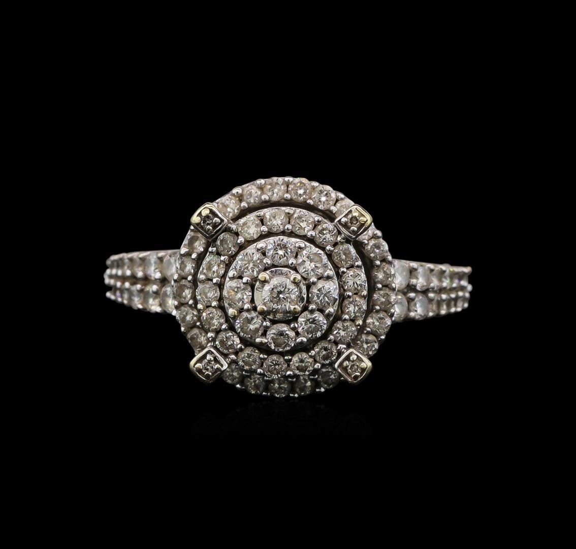 One electronically tested 14KT white gold ladies cast diamond ring. The ring features a cathedral set organized diamond cluster set within a diamond bezel supported by a lattice under gallery and diamond set shoulders, completed by a one and one-half millimeter wide band. Bright polish finish. Identified with markings of '14K'. Condition is good. Containing: Seventeen prong set round brilliant cut diamonds, measuring 1.90 - 1.60 x 1.05mm (depth est.) approximate total weight of 17 Stones = 0.43ct. Graded in the setting. Clarity SI-2 to I-1. Color: H - J Sixty-Two prong set round brilliant cut diamonds, measuring 1.30 - 1.10 x 0.72mm (depth est.) approximate total weight of 62 Stones = 0.50ct. Graded in the setting. Clarity SI-2 to I-1. Color: H - J Forty-Four bead set single cut diamonds, measuring 0.90 - 0.70 x 0.48mm (depth est.) approximate total weight of 44 Stones = 0.10ct. Graded in the setting. Clarity SI-1 to SI-2. Color: H - J. Total Weight of Diamonds 1.03ct.. Total Weight of Ring 5.60gm. AIG Appraised at $4,350.00.
