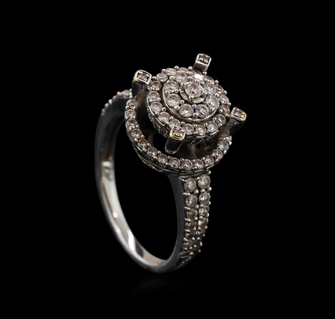 One electronically tested 14KT white gold ladies cast diamond ring. The ring features a cathedral set organized diamond cluster set within a diamond bezel supported by a lattice under gallery and diamond set shoulders, completed by a one and one-half millimeter wide band. Bright polish finish. Identified with markings of '14K'. Condition is good. Containing: Seventeen prong set round brilliant cut diamonds, measuring 1.90 - 1.60 x 1.05mm (depth est.) approximate total weight of 17 Stones = 0.43ct. Graded in the setting. Clarity SI-2 to I-1. Color: H - J Sixty-Two prong set round brilliant cut diamonds, measuring 1.30 - 1.10 x 0.72mm (depth est.) approximate total weight of 62 Stones = 0.50ct. Graded in the setting. Clarity SI-2 to I-1. Color: H - J Forty-Four bead set single cut diamonds, measuring 0.90 - 0.70 x 0.48mm (depth est.) approximate total weight of 44 Stones = 0.10ct. Graded in the setting. Clarity SI-1 to SI-2. Color: H - J. Total Weight of Diamonds 1.03ct.. Total Weight of Ring 5.60gm. AIG Appraised at $4,350.00.