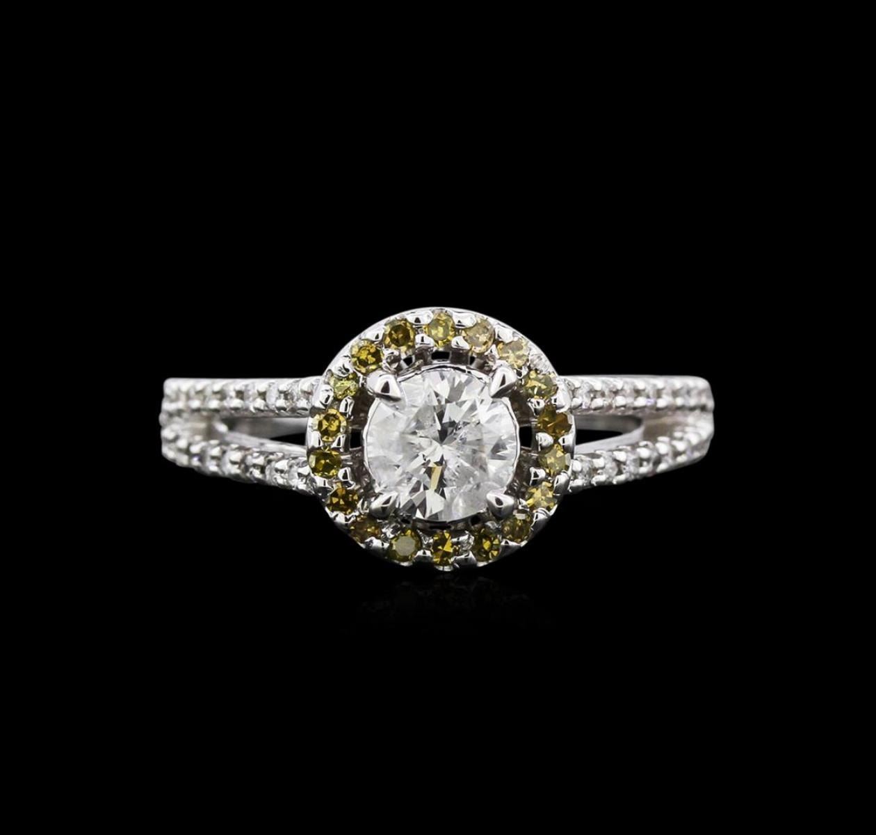 One stamped & tested 14KT white gold lady's cast wedding ring with a split shank with a bright polish finish. Condition is new. Identified with markings of "14K". Containing: One prong set round brilliant cut diamond, measuring 5.50 - 5.30 x 3.51mm (depth est.) approximate weight of 0.65ct. Clarity: I-1. Color: F. Cut: Fair. Eighteen shared prong set round brilliant cut diamonds, measuring 1.30 - 1.25 x 0.77mm (depth est.) approximate total weight of 18 Stones = 0.18ct, clarity enhanced. Clarity: SI-1 to SI-2. Color: Fancy Yellow Green. Cut: Very Good. Forty shared prong set round brilliant cut diamonds, measuring 1.10 - 1.00 x 0.68mm (depth est.) approximate total weight of 40 Stones = 0.20ct. Clarity: VS-2 to SI-2. Color: G - H. Cut: Very Good. Total Weight of Diamonds: 1.03ct. Total Weight of Ring: 5.10 gm. GAS Appraised.