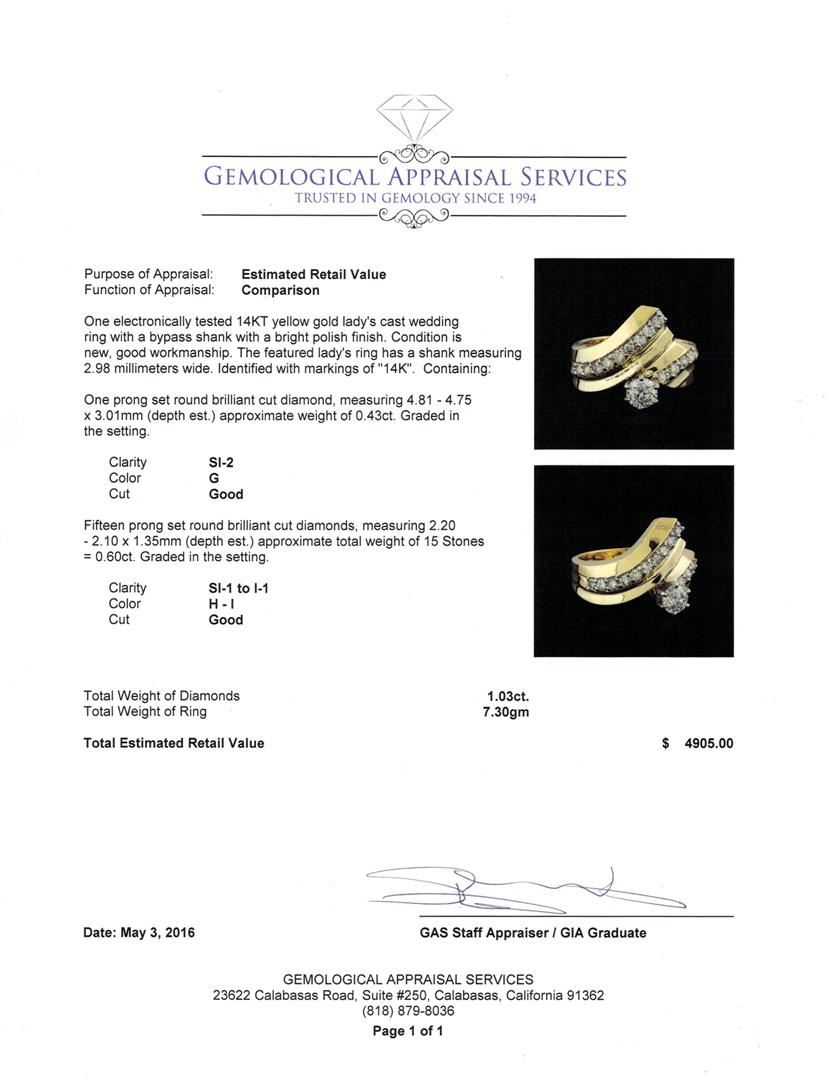 One electronically tested 14KT yellow gold lady's cast wedding ring with a bypass shank with a bright polish finish. The featured lady's ring has a shank measuring 2.98 millimeters wide. Identified with markings of "14K". Condition is new, good workmanship. Containing: One prong set round brilliant cut diamond, measuring 4.81 - 4.75 x 3.01mm (depth est.) approximate weight of 0.43ct. Graded in the setting. Clarity: SI-2. Color: Good Fifteen prong set round brilliant cut diamonds, measuring 2.20 - 2.10 x 1.35mm (depth est.) approximate total weight of 15 Stones = 0.60ct. Graded in the setting. Clarity: SI-1 to I-1. Color: H - I. Cut Good. Total Weight of Diamonds 1.03ct. Total Weight of Ring 7.30gm GAS Appraised at $4,905.00.