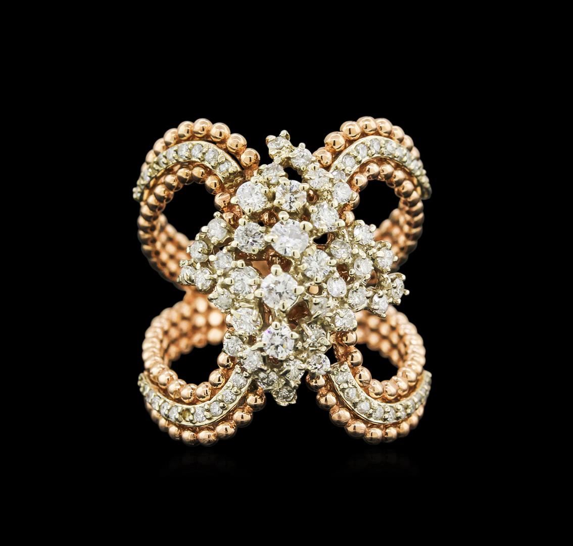 One electronically tested 14KT yellow and rose gold lady's combination cast & assembled fashion ring with a split shank with a bright polish finish. The featured lady's ring has a bead-style shank with a diamond shaped cluster, measuring 5.84 millimeters wide. Identified with markings of "14K". Condition is new, good workmanship. Containing: Thirty-Seven prong set round brilliant cut diamonds, measuring 2.60 - 1.40 x 1.20mm (depth est.) approximate total weight of 37 Stones = 0.81ct. Graded in the setting. Clarity: SI-2 to I-1. Color: I - Good Forty-Four prong set round brilliant cut diamonds, measuring 1.10 - 1.05 x 0.70mm (depth est.) approximate total weight of 44 Stones = 0.22ct. Graded in the setting. Clarity: SI-2 to I-2. Color: I - Good. Total Weight of Diamonds 1.03ct. Total Weight of Ring 8.50gm. GAS Appraised at $3,710.00.