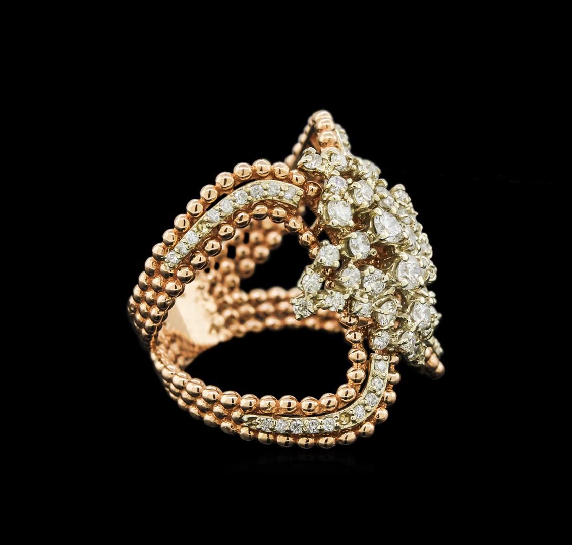 One electronically tested 14KT yellow and rose gold lady's combination cast & assembled fashion ring with a split shank with a bright polish finish. The featured lady's ring has a bead-style shank with a diamond shaped cluster, measuring 5.84 millimeters wide. Identified with markings of "14K". Condition is new, good workmanship. Containing: Thirty-Seven prong set round brilliant cut diamonds, measuring 2.60 - 1.40 x 1.20mm (depth est.) approximate total weight of 37 Stones = 0.81ct. Graded in the setting. Clarity: SI-2 to I-1. Color: I - Good Forty-Four prong set round brilliant cut diamonds, measuring 1.10 - 1.05 x 0.70mm (depth est.) approximate total weight of 44 Stones = 0.22ct. Graded in the setting. Clarity: SI-2 to I-2. Color: I - Good. Total Weight of Diamonds 1.03ct. Total Weight of Ring 8.50gm. GAS Appraised at $3,710.00.