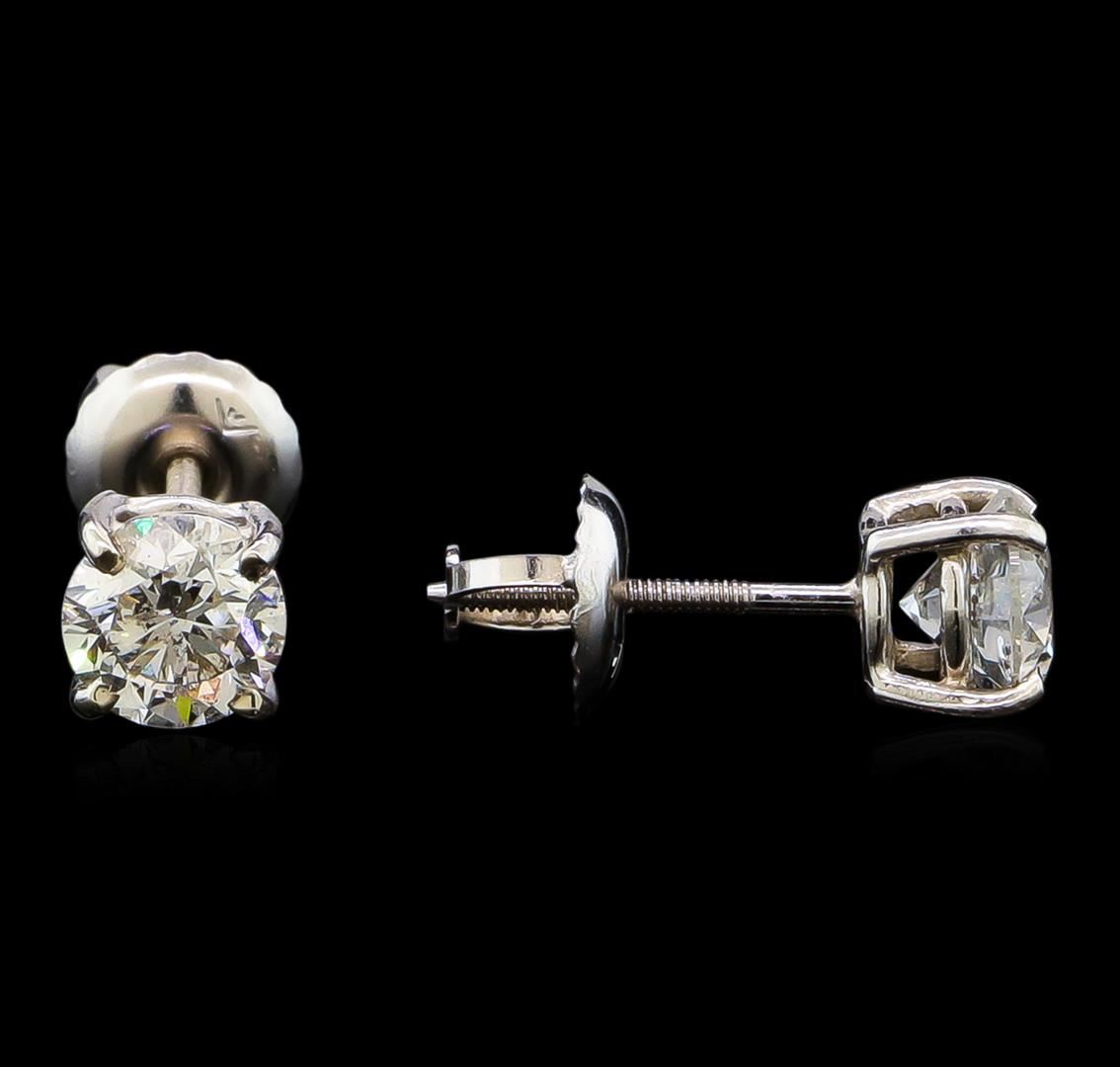 One pair electronically tested 14KT white gold lady's combination cast & assembled diamond stud earrings with threaded posts and screw-on/screw-off backs with a basket setting with a bright polish finish. Identified with markings of "14K". Condition is new, good workmanship. Containing: One prong set round brilliant cut diamond, measuring 4.98 - 4.97 x 3.44mm (depth est.) approximate weight of 0.52ct. Graded in the setting. Clarity: I-1. Color: G - Good One prong set round brilliant cut diamond, measuring 4.98 - 4.97 x 3.34mm (depth est.) approximate weight of 0.51ct. Graded in the setting. Clarity: SI-1. Color: Good. Total Weight of Diamonds 1.03ct. Total Weight of Stud Earrings 1.00gm. GAS Appraised at $6,370.00.