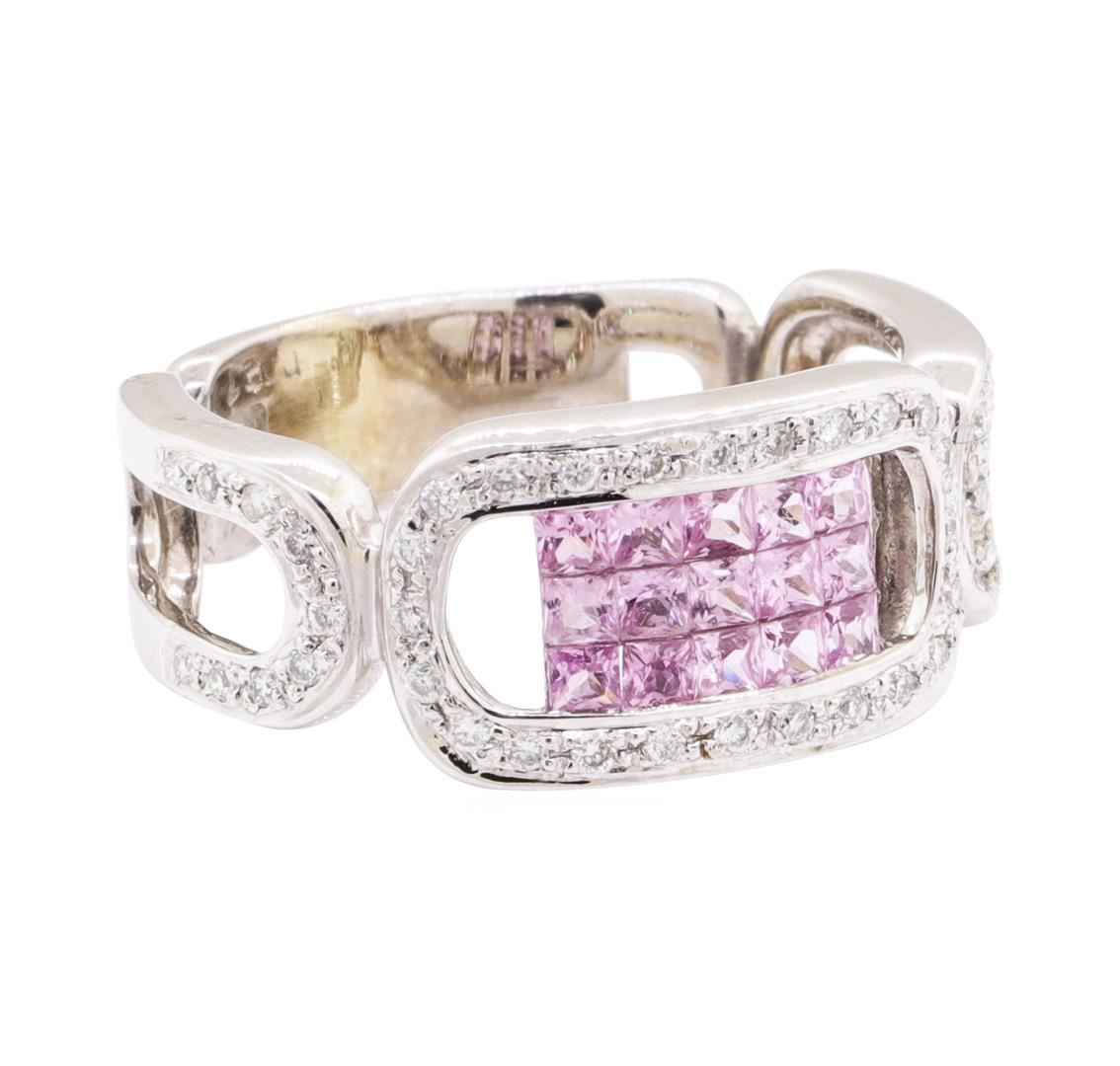 One electronically tested 14KT white gold lady's cast fashion link motif ring with a bright polish finish. The featured lady's ring has four connected links and has a shank measuring 5.70 millimeters wide. Identified with markings of '14K'. Condition is like new, good workmanship. Containing: Fifteen invisible set princess modified brilliant cut natural pink sapphires, measuring 2.00 x 2.00 x 1.30mm, (depth est.) approximate total weight of 0.76ct., clarity is eye clean, medium light, moderately strong, slightly purplish red color, (GIA slpR 4/4), cut is very good. Transmitting light with no distortion, transparent. Colored gemstones are presumed to have been subjected to commonly used enhancement processes. Graded in the setting. Forty-Two prong set round brilliant cut diamonds, measuring 1.20 - 1.15 x 0.73mm (depth est.) approximate total weight of 42 Stones = 0.27ct. Graded in the setting. Color G - H Clarity VS-2 to SI-1 Cut Good. Total Weight of Colored Stones 0.76ct.. Total Weight of Diamonds 0.27ct.. Total Weight of Ring 6.00gm GAS Appraised at $2790.00. GAS Appraised at $2,790.00.