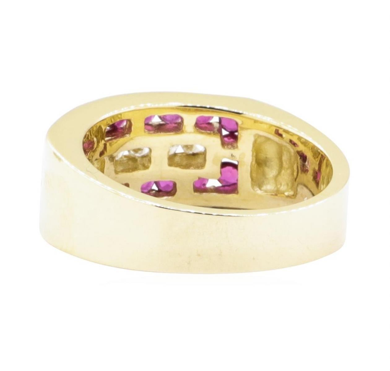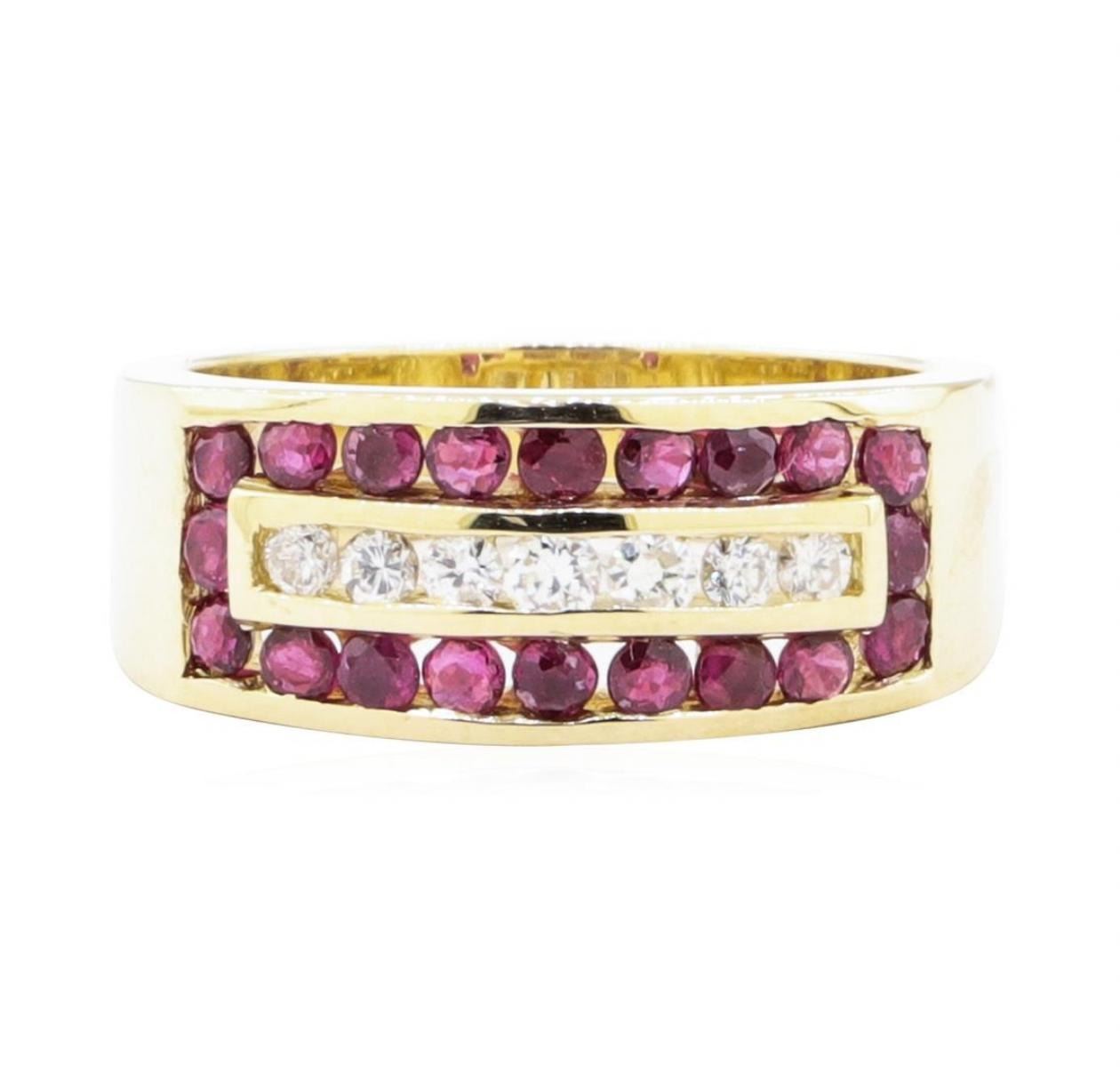 One electronically tested 14KT yellow gold lady's cast fashion ring with a tapered wide band with a bright polish finish. The featured lady's ring has a shank measuring 4.20 millimeters wide. Identified with markings of '14K'. Condition is Good. Containing: Twenty channel set round modified mixed cut natural rubies, measuring 2.00 - 1.90 x 1.27 mm, (depth est.) 5%. bulge factor, approximate total weight of 0.80ct., clarity is slightly included, medium, moderately strong, slightly purplish red color, (GIA slpR 5/4), cut is good. Transmitting light with a minimum of distortion, transparent. Colored gemstones are presumed to have been subjected to commonly used enhancement processes. Graded in the setting. Seven channel set round brilliant cut diamonds, measuring 2.20 - 1.90 x 1.27mm (depth est.) approximate total weight of 7 Stones = 0.23ct. Graded in the setting. Color H - I Clarity SI-1 to SI-2 Cut Good. Total Weight of Colored Stones 0.80ct.. Total Weight of Diamonds 0.23ct.. Total Weight of Ring 6.70gm GAS Appraised at $2240.00. GAS Appraised at $3,565.00.