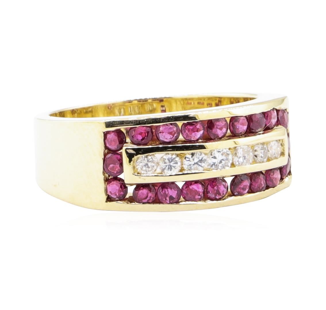 One electronically tested 14KT yellow gold lady's cast fashion ring with a tapered wide band with a bright polish finish. The featured lady's ring has a shank measuring 4.20 millimeters wide. Identified with markings of '14K'. Condition is Good. Containing: Twenty channel set round modified mixed cut natural rubies, measuring 2.00 - 1.90 x 1.27 mm, (depth est.) 5%. bulge factor, approximate total weight of 0.80ct., clarity is slightly included, medium, moderately strong, slightly purplish red color, (GIA slpR 5/4), cut is good. Transmitting light with a minimum of distortion, transparent. Colored gemstones are presumed to have been subjected to commonly used enhancement processes. Graded in the setting. Seven channel set round brilliant cut diamonds, measuring 2.20 - 1.90 x 1.27mm (depth est.) approximate total weight of 7 Stones = 0.23ct. Graded in the setting. Color H - I Clarity SI-1 to SI-2 Cut Good. Total Weight of Colored Stones 0.80ct.. Total Weight of Diamonds 0.23ct.. Total Weight of Ring 6.70gm GAS Appraised at $2240.00. GAS Appraised.