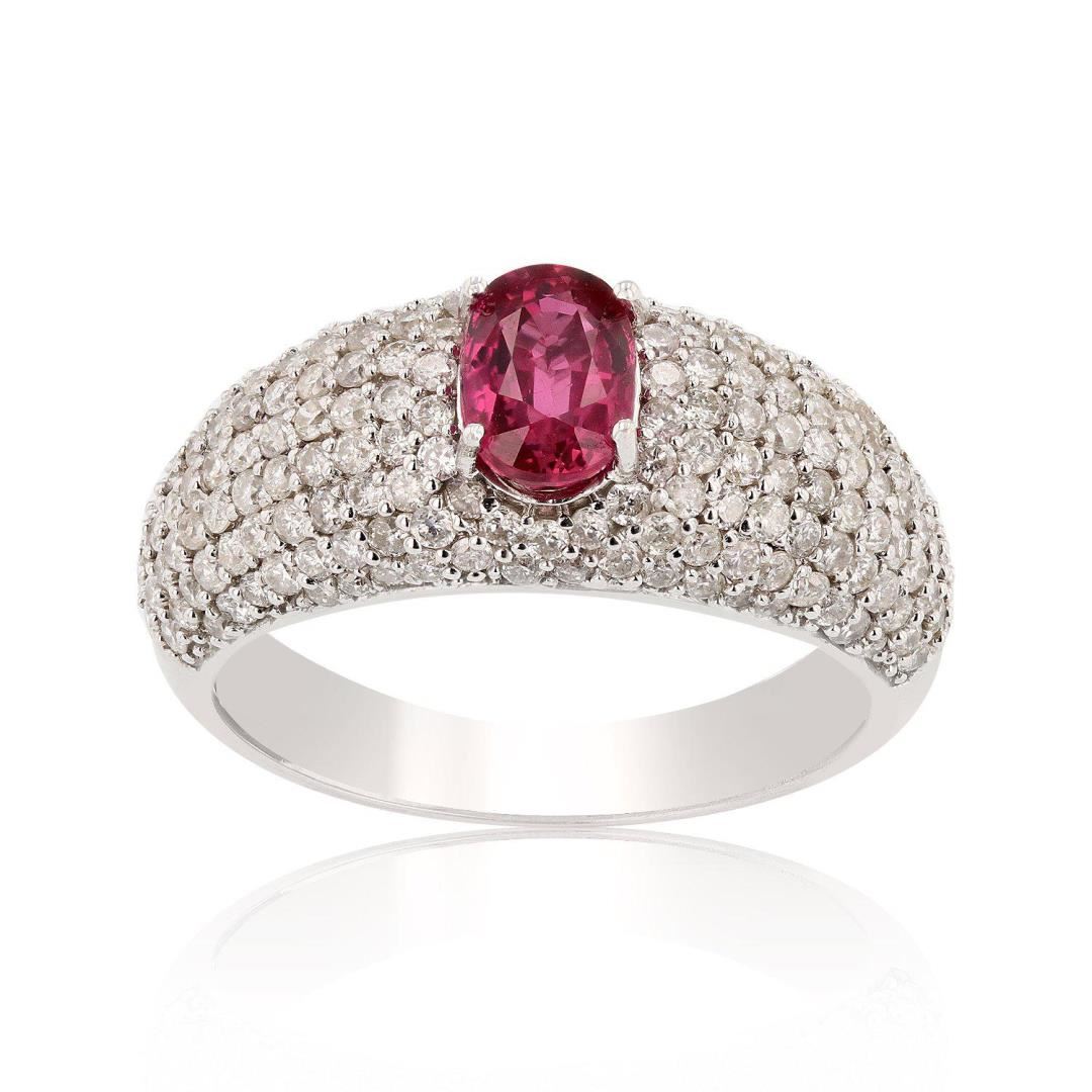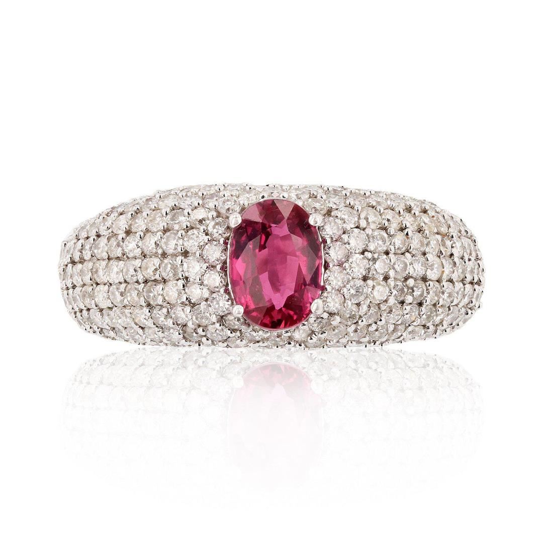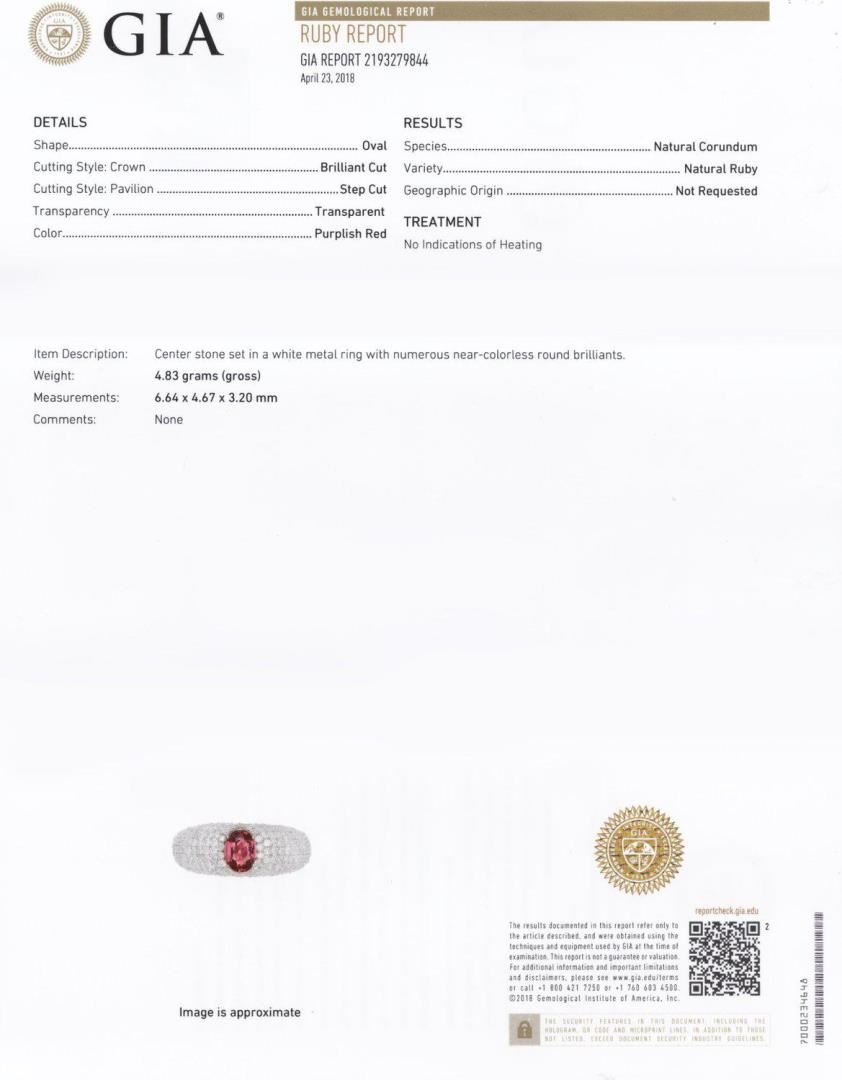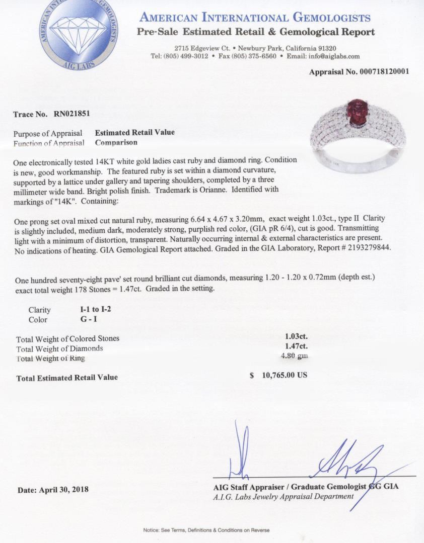 One electronically tested 14KT white gold ladies cast ruby and diamond ring. Condition is new, good workmanship. The featured ruby is set within a diamond curvature, supported by a lattice under gallery and tapering shoulders, completed by a three millimeter wide band. Bright polish finish. Trademark is Orianne. Identified with markings of "14K". Containing: One prong set oval mixed cut natural ruby, measuring 6.64 x 4.67 x 3.20mm, exact weight 1.03ct., type II Clarity is slightly included, medium dark, moderately strong, purplish red color, (GIA pR 6/4), cut is good. Transmitting light with a minimum of distortion, transparent. Naturally occurring internal and external characteristics are present. No indications of heating. GIA Gemological Report attached. Graded in the GIA Laboratory, Report # 2193279844. One hundred seventy-eight pave' set round brilliant cut diamonds, measuring 1.20 - 1.20 x 0.72mm (depth est.) exact total weight 178 Stones = 1.47ct. Graded in the setting. Clarity I-1 to I-2 Color G - I Total Weight of Colored Stones 1.03ct. Total Weight of Diamonds 1.47ct. Total Weight ol Ring 4.80 gm #LREF-4613