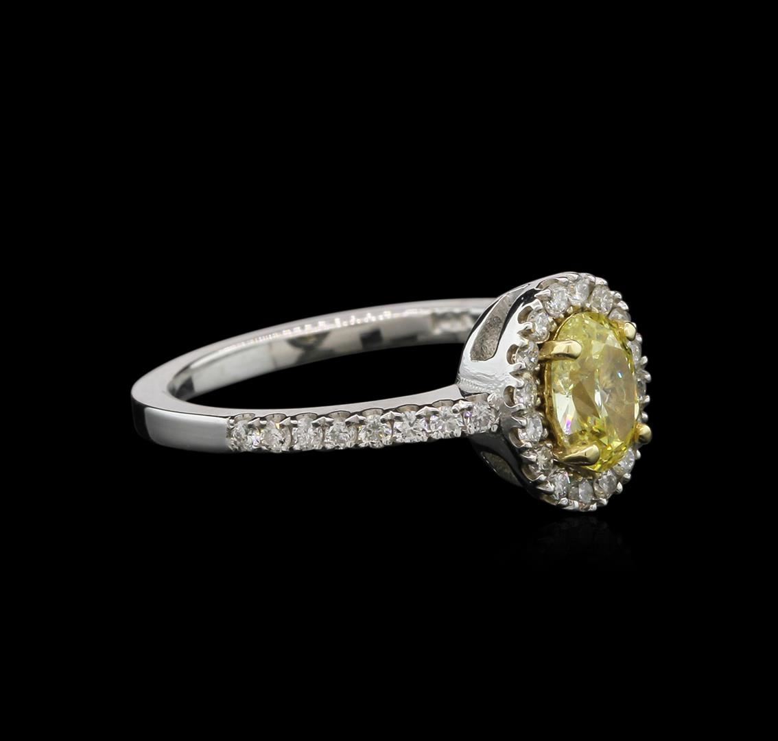 One ring featuring: 14KT white gold weighing 3.38 grams containing one prong set oval shape yellow diamond center stone with a total weight of 0.67ct and pave set round white diamonds with a total weight of 0.36ct.