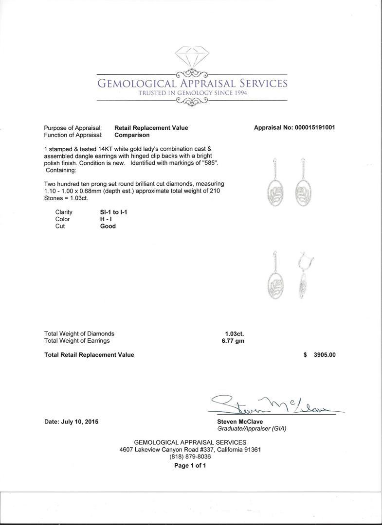 One stamped & tested 14KT white gold lady's combination cast & assembled dangle earrings with hinged clip backs with a bright polish finish. Condition is new. Identified with markings of "585". Containing: Two hundred ten prong set round brilliant cut diamonds, measuring 1.10 - 1.00 x 0.68mm (depth est.) approximate total weight of 210 Stones = 1.03ct. Clarity: SI-1 to I-1. Color: H - I. Cut: Good. Total Weight of Diamonds: 1.03ct. Total Weight of Earrings: 6.77 gm. GAS Appraised at $3,905.00.