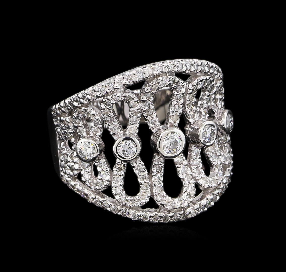 One electronically tested 14KT white gold lady's cast fashion ring with a tapered shank with a bright polish finish. The featured lady's ring has five figure 8 motifs with a wide band and a shank measuring 4.27 millimeters wide. Identified with markings of "K14". Condition is new, good workmanship. Containing: One bezel set round brilliant cut diamond, measuring 2.80 - 2.75 x 1.73mm (depth est.) approximate weight of 0.08ct. Graded in the setting. Clarity: SI-1. Color: Very Good Four bezel set round brilliant cut diamonds, measuring 2.40 - 2.30 x 1.46mm (depth est.) approximate total weight of 4 Stones = 0.20ct. Graded in the setting. Clarity: SI-1 to SI-2. Color: H - I. Cut Very Good One Hundred Fifty-Two prong set round brilliant cut diamonds, measuring 1.15 - 1.05 x 0.67mm (depth est.) approximate total weight of 152 Stones = 0.75ct. Graded in the setting. Clarity: SI-1 to I-1. Color: H - I. Cut Good. Total Weight of Diamonds 1.03ct. Total Weight of Ring 7.80gm. GAS Appraised at $5,535.00.