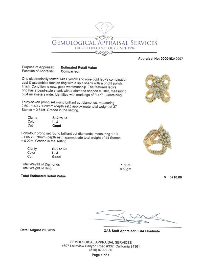 One electronically tested 14KT yellow and rose gold lady's combination cast & assembled fashion ring with a split shank with a bright polish finish. The featured lady's ring has a bead-style shank with a diamond shaped cluster, measuring 5.84 millimeters wide. Identified with markings of "14K". Condition is new, good workmanship. Containing: Thirty-Seven prong set round brilliant cut diamonds, measuring 2.60 - 1.40 x 1.20mm (depth est.) approximate total weight of 37 Stones = 0.81ct. Graded in the setting. Clarity: SI-2 to I-1. Color: I - Good Forty-Four prong set round brilliant cut diamonds, measuring 1.10 - 1.05 x 0.70mm (depth est.) approximate total weight of 44 Stones = 0.22ct. Graded in the setting. Clarity: SI-2 to I-2. Color: I - Good. Total Weight of Diamonds 1.03ct. Total Weight of Ring 8.50gm. GAS Appraised at $3,710.00.