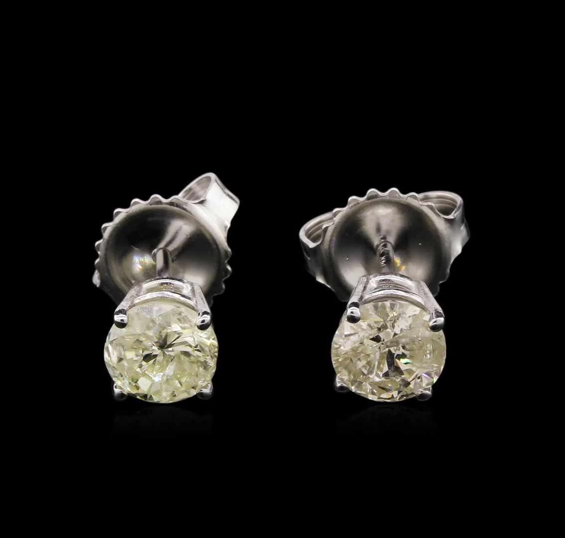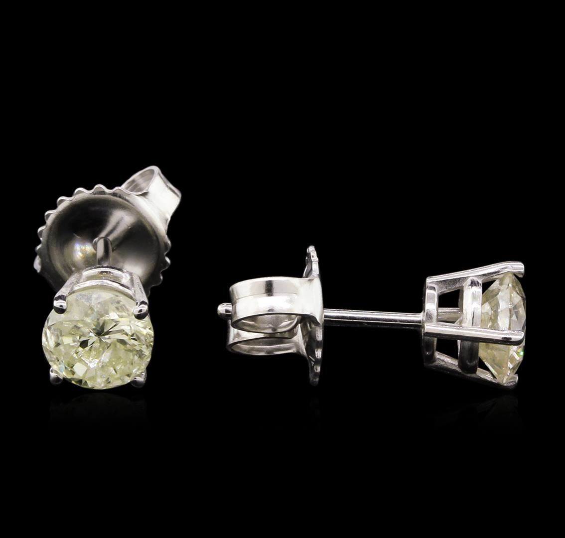 One pair electronically tested 14KT white gold cast & assembled diamond solitaire earrings with standard backs. Identified with markings of "14K". Condition is new, good workmanship. Containing: One prong set round brilliant cut diamond, measuring 5.10 - 5.10 x 3.20mm (depth est.) approximate weight of 0.51ct with a strong blue fluorescence. Graded in the setting. Clarity: I-2. Color: J. Depth 62.8%. Table 59.8%. One prong set round brilliant cut diamond, measuring 5.10 - 5.10 x 3.25mm (depth est.) approximate weight of 0.52ct with a medium strong blue fluorescence. Graded in the setting. Clarity: I-2. Color: M. Depth 63.7%. Table 66.7%. Total Weight of Diamonds 1.03ct. Total Weight of Earrings 1.11gm. AIG Appraised at $2,755.00.