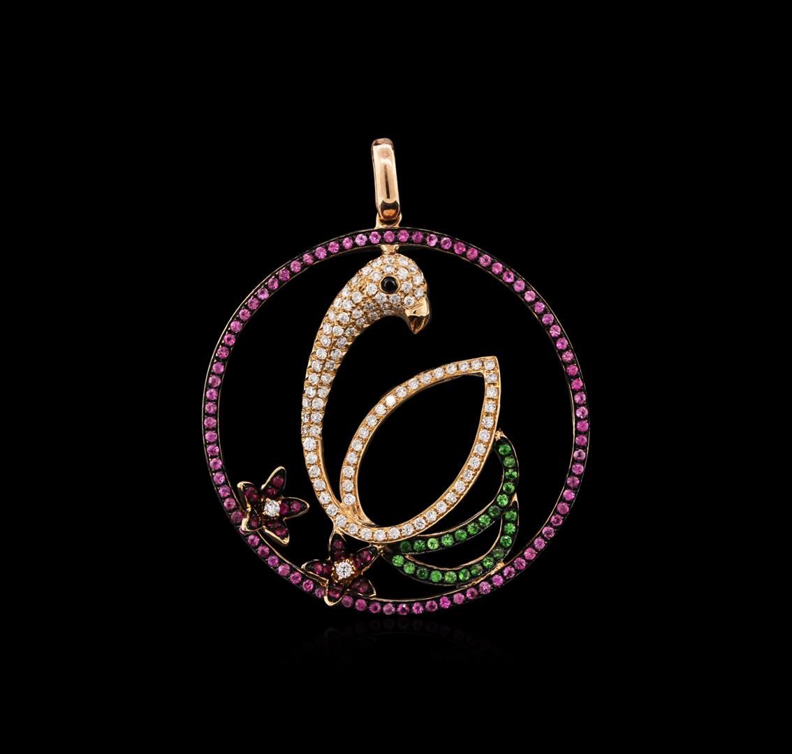 One electronically tested 18KT rose gold ladies cast ruby, tsavorite garnet and diamond pendant with a bright polish finish. Identified with markings of "18K". Condition is new. Containing: One hundred three prong set round modified brilliant cut natural rubies, measuring 1.00 - 1.00 x 0.65 mm, approximate total weight of 1.03ct., clarity is moderately included, type II, medium, moderately strong, strongly purplish red color, (GIA stpR 5/4), cut is good. Twenty-five prong set round modified brilliant cut natural tsavorite garnets, measuring 1.30 - 1.30 x 0.85 mm, approximate total weight of 0.25ct., clarity is slightly included, type II, medium, moderately strong, green color, (GIA G 5/4), cut is good. Ninety-Four prong set round brilliant cut diamonds, measuring 1.20 - 1.20 x 0.72mm (depth est.) approximate total weight of 94 Stones = 0.59ct. Clarity: I-1 to I-2. Color: G - H, Cut is Good. One prong set round brilliant cut diamond, measuring 1.30 - 1.30 x 0.00mm (depth est.) approximate weight of 0.01ct. Cut is Good. Colored gemstones are presumed to have been subjected to commonly used enhancement processes. All diamonds and colored gemstones are graded in the mounting, unless otherwise stated. Total Weight of Colored Stones 1.28ct. Total Weight of Diamonds 0.60ct. Total Weight of Pendant 8.90 grams. GGL Appraised at $3,720.00.