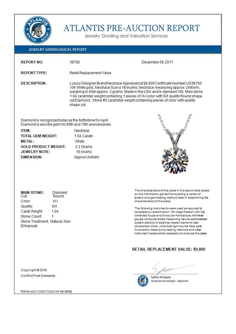 REF-147Y2K -36750 ---- 1.04 CTW Certified H-SI/I Quality Diamond Solitaire Necklace 10K White Gold ---- Luxury Designer Brand Necklace Appraised at $9,800 Certificate Number US36750 10k White gold, Necklace Size is 16 Incehs, Necklace measuring approx. Uniform, weighing in total approx. 2 grams. Made in the USA and is stamped 10k, Main stone 1.04 carat total weight containing 1 pieces of H-I color with SI/I quality Round shape cut Diamond , Stone #2 carat total weight containing pieces of color with quality shape cut