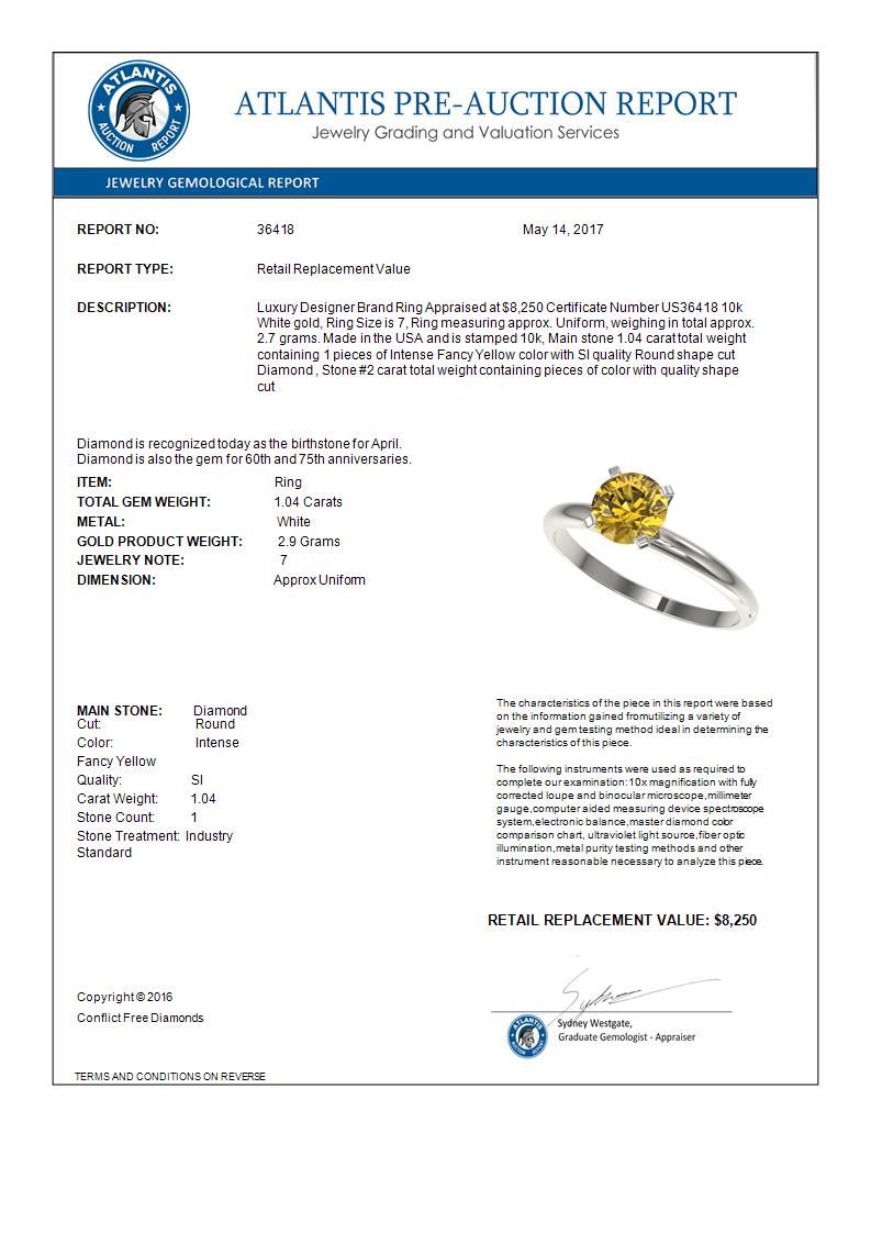 1.04 CTW Certified Intense Yellow SI Diamond Solitaire Engagement Ring 10K White Gold ---- Luxury Designer Brand Ring Appraised Retail Price at $8,250 ---- SKU Number US36418 10k White gold Ring Size is 7, Ring measuring approx. Uniform, weighing in total approx. 2.7 grams. Made in the USA and is stamped 10k, Main stone 1.04 carat total weight containing 1 pieces of Intense Fancy Yellow color with SI quality Round shape cut Diamond , Stone #2 carat total weight containing pieces of color with quality shape cut
