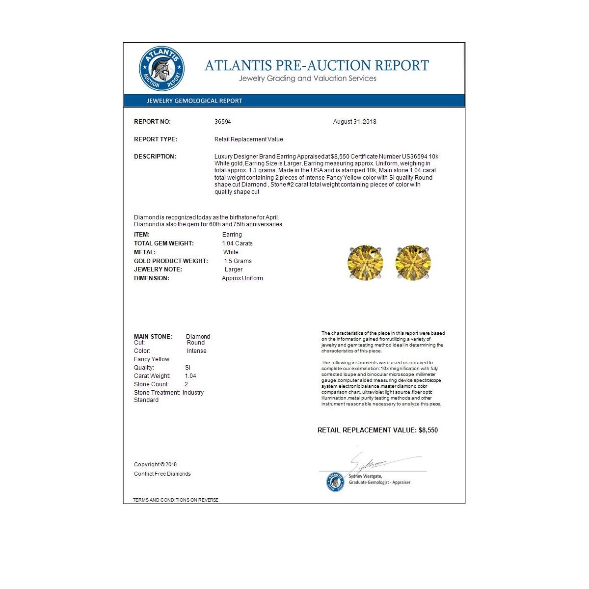 REF-116H3A -36594 ---- 1.04 CTW Certified Intense Yellow SI Diamond Solitaire Stud Earrings 10K White Gold ---- Luxury Designer Brand Earring Appraised at $8,550 Certificate Number US36594 10k White gold, Earring Size is Larger, Earring measuring approx. Uniform, weighing in total approx. 1.3 grams. Made in the USA and is stamped 10k, Main stone 1.04 carat total weight containing 2 pieces of Intense Fancy Yellow color with SI quality Round shape cut Diamond , Stone #2 carat total weight containing pieces of color with quality shape cut