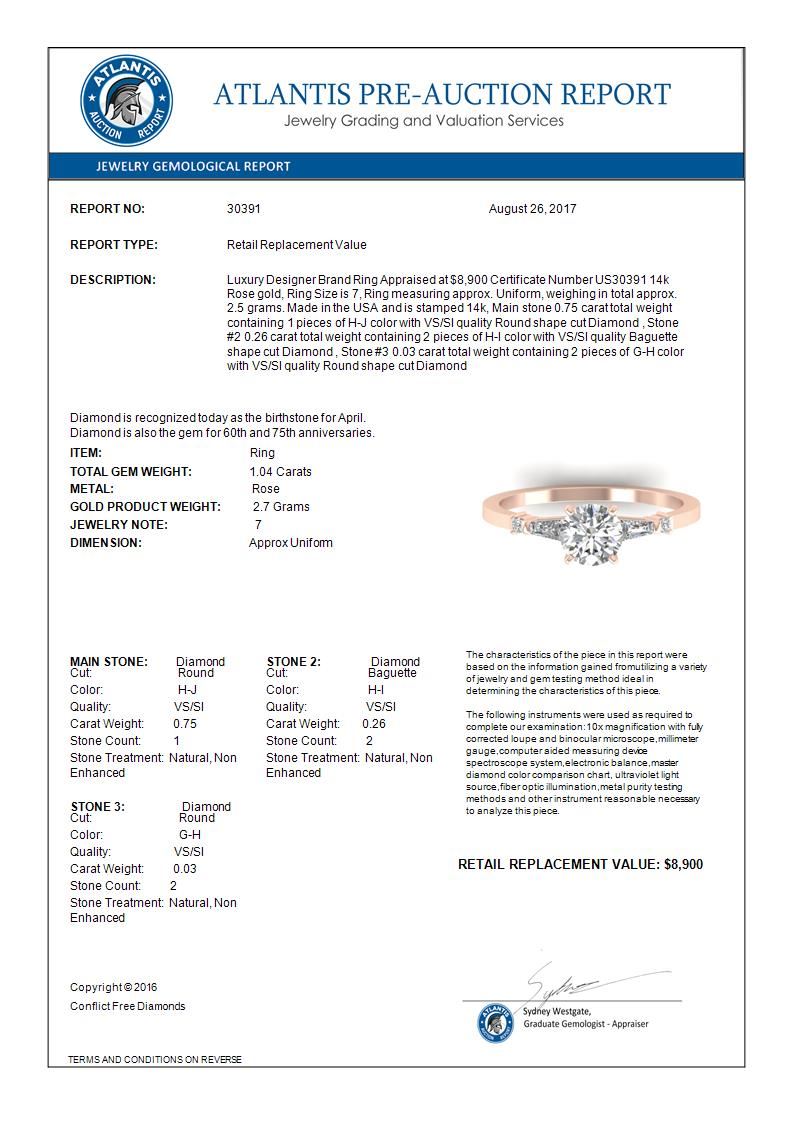 30391 - REF-179N6A ---- 1.04 CTW Certified VS/SI Diamond Solitaire Ring 14K Rose Gold ---- Luxury Designer Brand Ring Appraised at $8,900 Certificate Number US30391 14k Rose gold, Ring Size is 7, Ring measuring approx. Uniform, weighing in total approx. 2.5 grams. Made in the USA and is stamped 14k, Main stone 0.75 carat total weight containing 1 pieces of H-J color with VS/SI quality Round shape cut Diamond , Stone #2 0.26 carat total weight containing 2 pieces of H-I color with VS/SI quality Baguette shape cut Diamond , Stone #3 0.03 carat total weight containing 2 pieces of G-H color with VS/SI quality Round shape cut Diamond