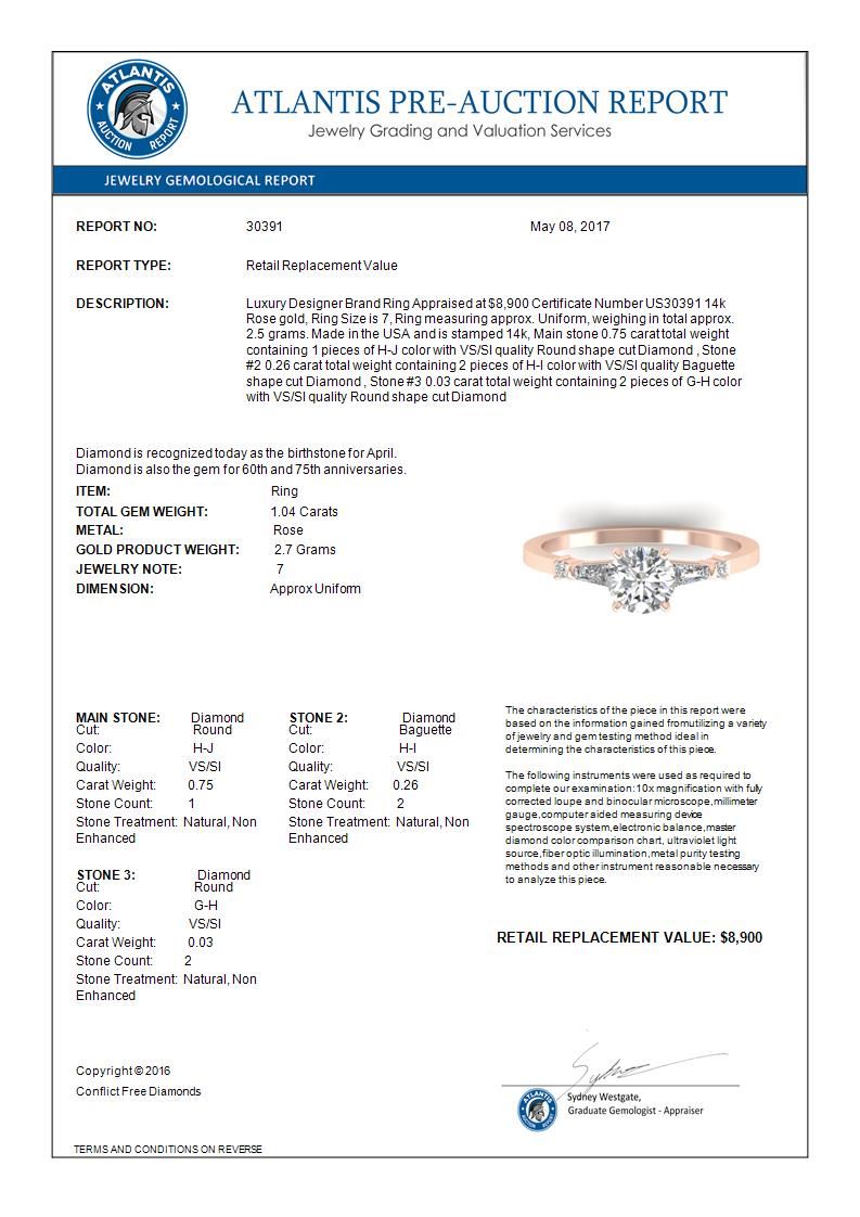 1.04 CTW Certified VS/SI Diamond Solitaire Ring 14K Rose Gold ---- Luxury Designer Brand Ring Appraised Retail Price at $8,900 ---- SKU Number US30391 14k Rose gold Ring Size is 7, Ring measuring approx. Uniform, weighing in total approx. 2.5 grams. Made in the USA and is stamped 14k, Main stone 0.75 carat total weight containing 1 pieces of H-J color with VS/SI quality Round shape cut Diamond , Stone #2 0.26 carat total weight containing 2 pieces of H-I color with VS/SI quality Baguette shape cut