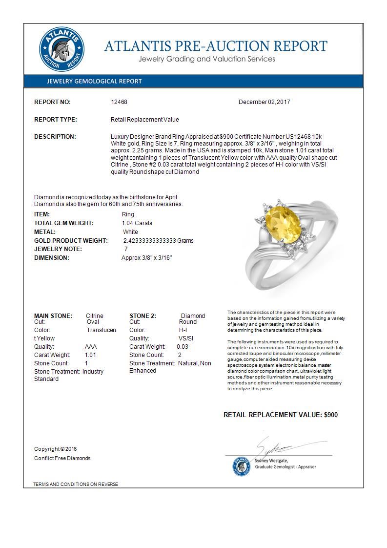 REF-15X3T -12468 ---- 1.04 CTW Citrine & Diamond Ring 10K White Gold ---- Luxury Designer Brand Ring Appraised at $900 Certificate Number US12468 10k White gold, Ring Size is 7, Ring measuring approx. 3/8" x 3/16" , weighing in total approx. 2.25 grams. Made in the USA and is stamped 10k, Main stone 1.01 carat total weight containing 1 pieces of Translucent Yellow color with AAA quality Oval shape cut Citrine , Stone #2 0.03 carat total weight containing 2 pieces of H-I color with VS/SI quality Round shape cut Diamond