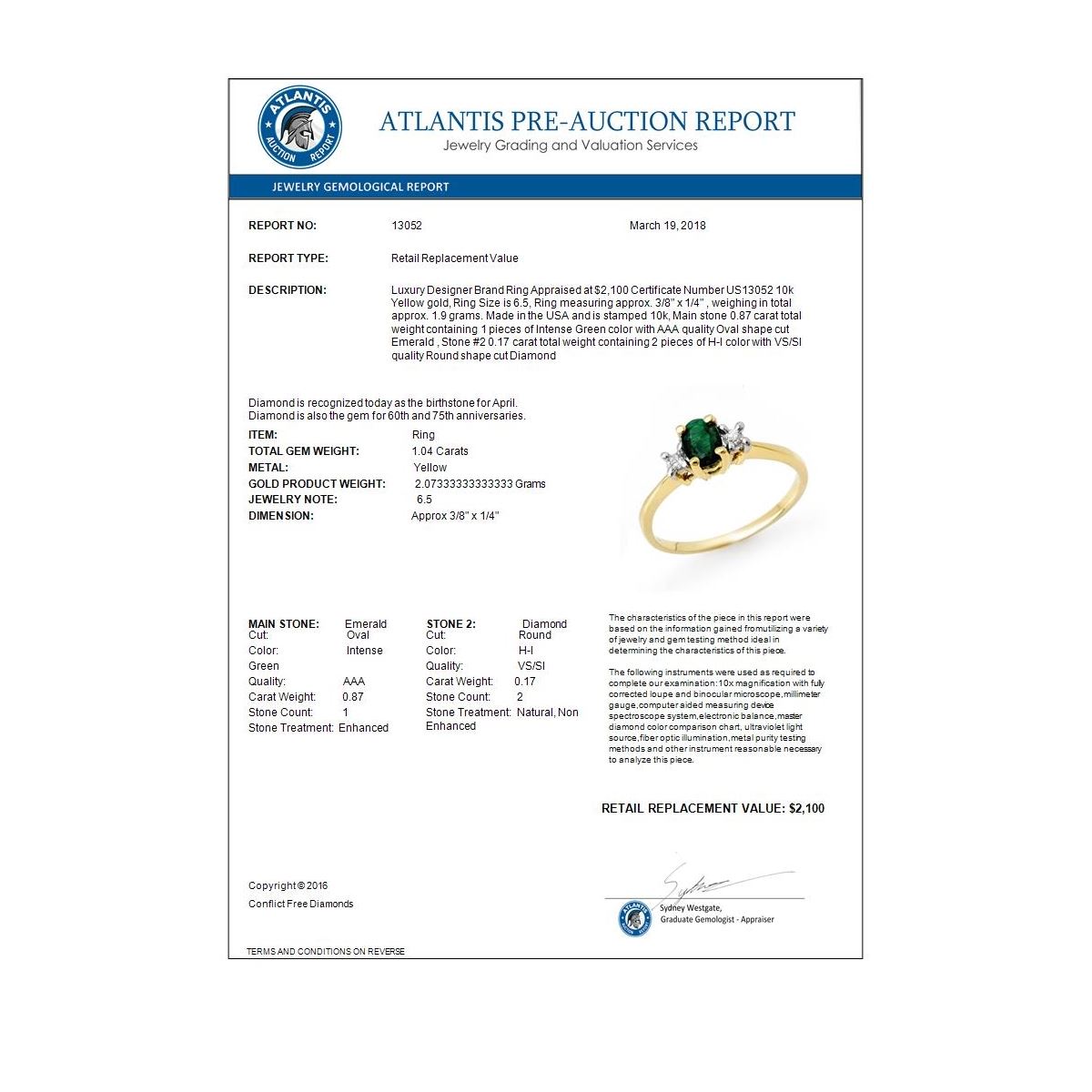 REF-31F8N -13052 ---- 1.04 CTW Emerald & Diamond Ring 10K Yellow Gold ---- Luxury Designer Brand Ring Appraised at $2,100 Certificate Number US13052 10k Yellow gold, Ring Size is 6.5, Ring measuring approx. 3/8" x 1/4" , weighing in total approx. 1.9 grams. Made in the USA and is stamped 10k, Main stone 0.87 carat total weight containing 1 pieces of Intense Green color with AAA quality Oval shape cut Emerald , Stone #2 0.17 carat total weight containing 2 pieces of H-I color with VS/SI quality Round shape cut Diamond