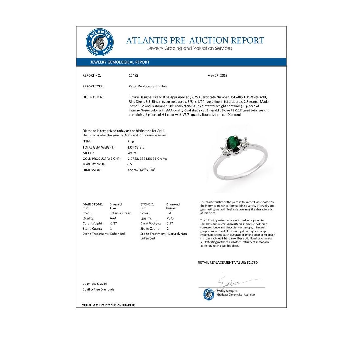 REF-41X8T -12485 ---- 1.04 CTW Emerald & Diamond Ring 18K White Gold ---- Luxury Designer Brand Ring Appraised at $2,750 Certificate Number US12485 18k White gold, Ring Size is 6.5, Ring measuring approx. 3/8" x 1/4" , weighing in total approx. 2.8 grams. Made in the USA and is stamped 18k, Main stone 0.87 carat total weight containing 1 pieces of Intense Green color with AAA quality Oval shape cut Emerald , Stone #2 0.17 carat total weight containing 2 pieces of H-I color with VS/SI quality Round shape cut Diamond