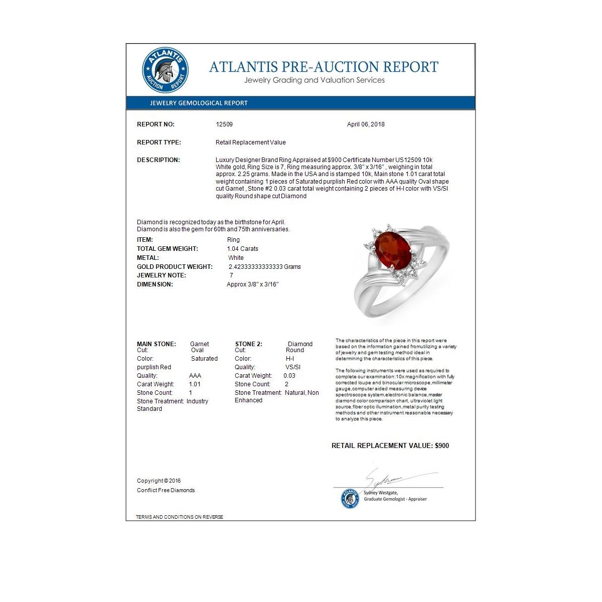 REF-14A5X -12509 ---- 1.04 CTW Garnet & Diamond Ring 10K White Gold ---- Luxury Designer Brand Ring Appraised at $900 Certificate Number US12509 10k White gold, Ring Size is 7, Ring measuring approx. 3/8" x 3/16" , weighing in total approx. 2.25 grams. Made in the USA and is stamped 10k, Main stone 1.01 carat total weight containing 1 pieces of Saturated purplish Red color with AAA quality Oval shape cut Garnet , Stone #2 0.03 carat total weight containing 2 pieces of H-I color with VS/SI quality Round shape cut Diamond