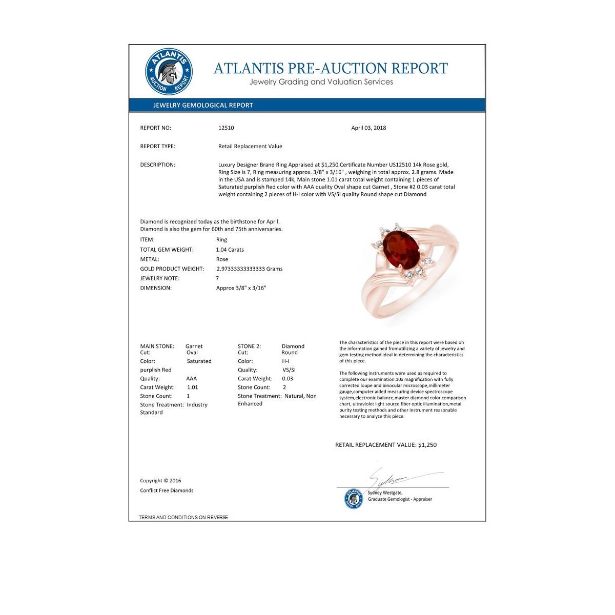REF-20N8Y -12510 ---- 1.04 CTW Garnet & Diamond Ring 14K Rose Gold ---- Luxury Designer Brand Ring Appraised at $1,250 Certificate Number US12510 14k Rose gold, Ring Size is 7, Ring measuring approx. 3/8" x 3/16" , weighing in total approx. 2.8 grams. Made in the USA and is stamped 14k, Main stone 1.01 carat total weight containing 1 pieces of Saturated purplish Red color with AAA quality Oval shape cut Garnet , Stone #2 0.03 carat total weight containing 2 pieces of H-I color with VS/SI quality Round shape cut Diamond